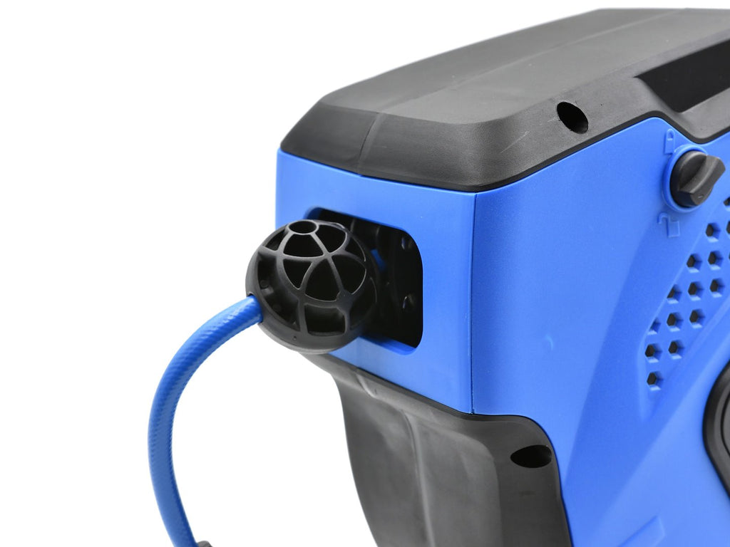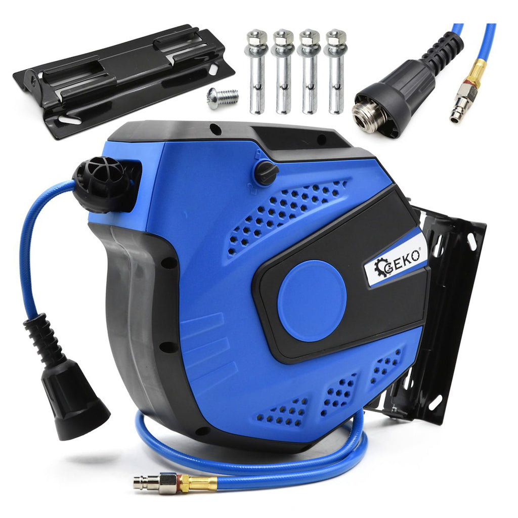 Този барабан с маркуч за сгъстен въздух 14 м с автоматично заключване и прибиране - GEKO е предназначен за използване в пневматични инсталации в работилници или гаражи, за да снабдява инструменти със сгъстен въздух. Маркучът е изработен от подсилен PVC, с висока устойчивост на налягане.