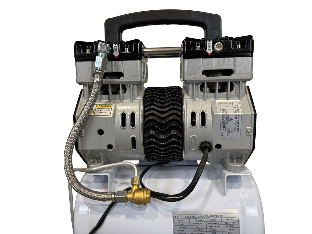 Безшумният компресор без масло 6 л GEBO TOOLS има резервоар с обем 6 литра и работи при максимално работно налягане от 8 бара. Оборудван е с двигател с мощност 1 к.с. и два цилиндъра. Захранването е с напрежение 220 V, с честота 50 Hz. Скоростта на въртене на двигателя е 1400 об/мин.