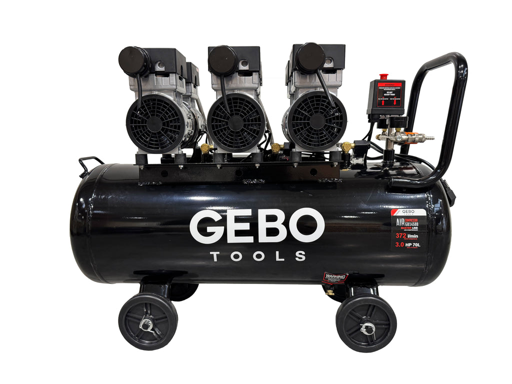 Безшумният компресор 70 л М2 GEBO TOOLS има резервоар с капацитет 70 литра и работи при максимално работно налягане 8 бара. Той е оборудван с 3 HP двигател и два цилиндъра. Напрежението на захранване е 220 V, с честота 50 Hz. Оборотите на двигателя са 1400 rpm.