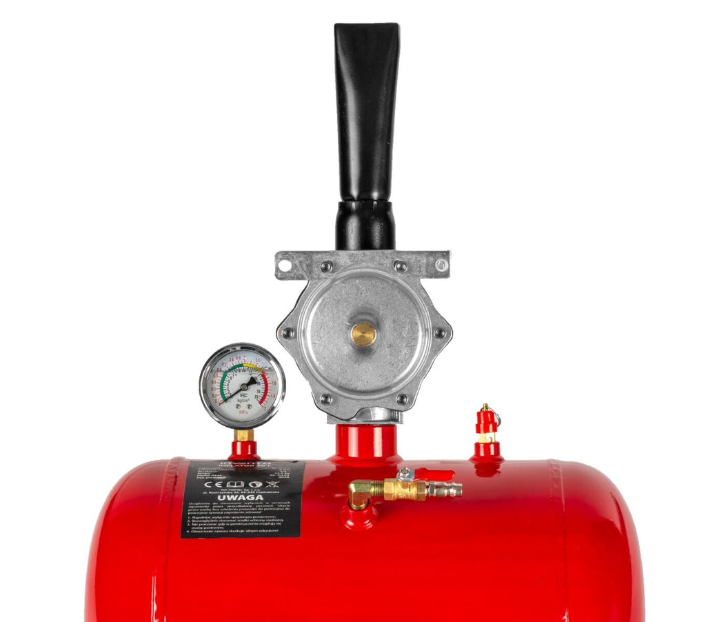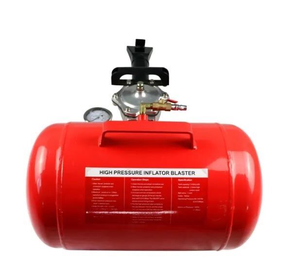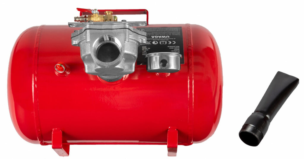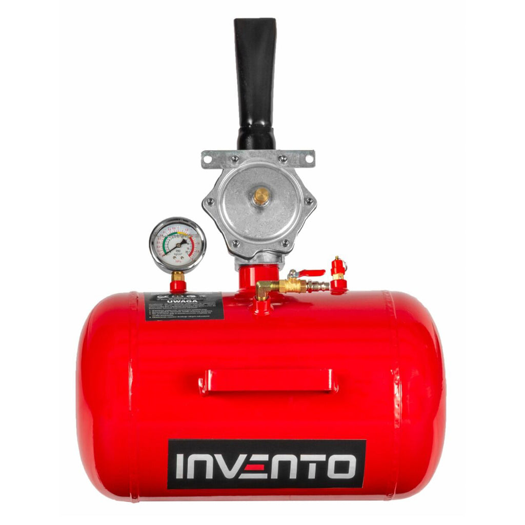 Тази бутилка за шоково помпане на гуми 20 л INVENTO е предназначена за бързо надуване на безкамерни гуми с помощта на въздушен амортисьор. Устройството е оборудвано с 20-литров въздушен резервоар и работи при работно налягане от 8 бара. Резервоарът има стоманена обшивка, а въздухът се изпуска през чугунена дюза с диаметър 45 мм.