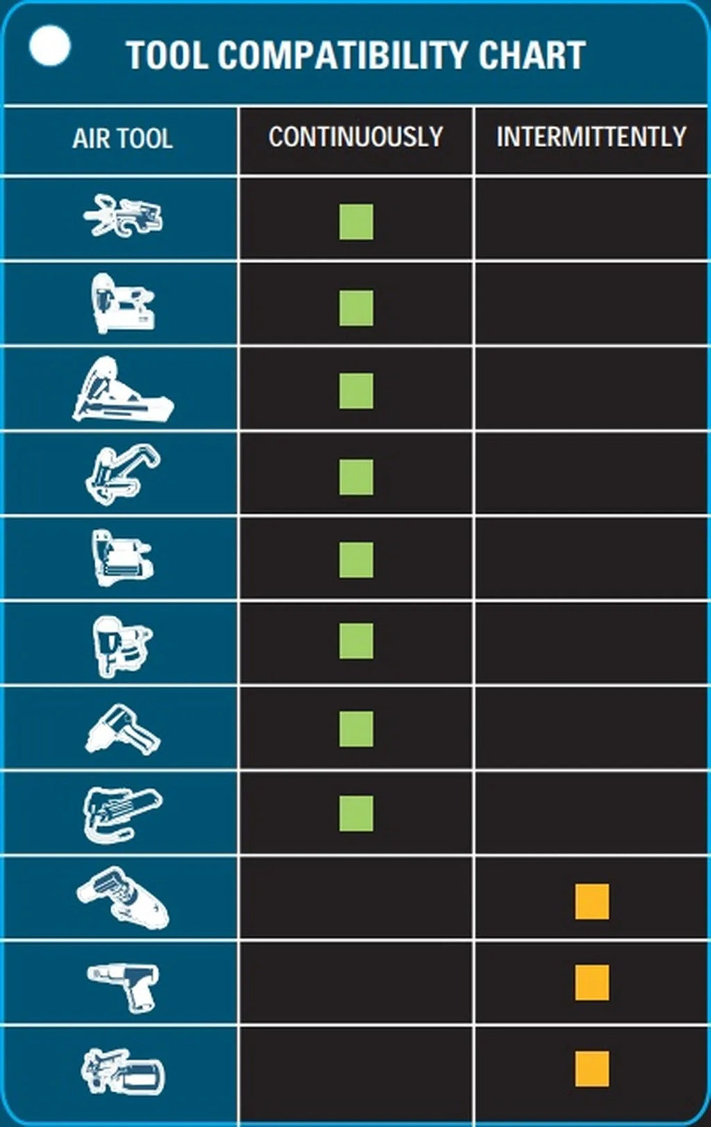 Компактният му вертикален дизайн улеснява пестенето на място, докато резервоарът от 50 литра позволява продължителна употреба без чести прекъсвания. Благодарение на безмаслената технология, работата е чиста и изисква ниска поддръжка. Нивото на шум е 85 dB, а класът на проектиране е IP30. Компресорът тежи 23,8 кг.