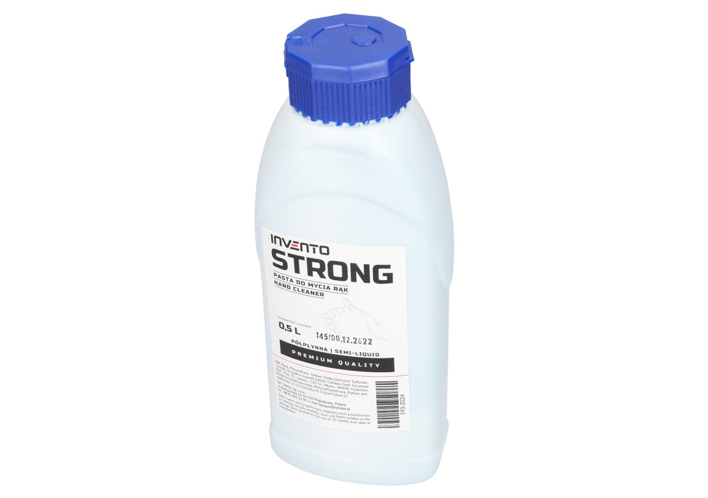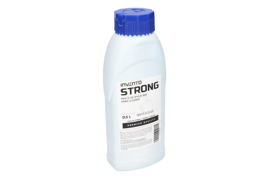 Гелът за дезинфекция на ръце 0,5 л STRONG INVENTO е предназначен за измиване на силно замърсени ръце в механични работилници, вулканизационни цехове, различни индустрии и селското стопанство. Продуктът е с полутечна консистенция и е формулиран за отстраняване на сажди, катран, боя, масло, спирачен прах и други технически замърсявания.