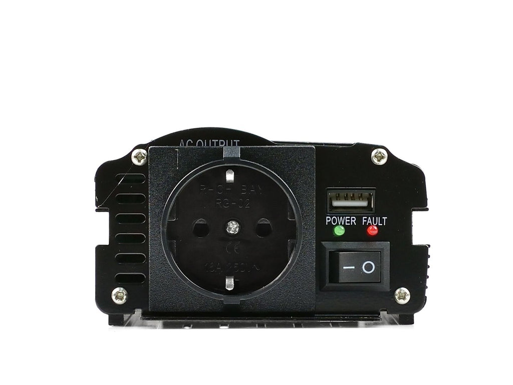 Този инвертор на напрежение 24-220V 500/1000W е проектиран да преобразува 24 V DC енергия от батерии или автомобилни инсталации в 230 V AC енергия. Устройството осигурява непрекъсната мощност от 500 W и максимална временна мощност от 1000 W, с модифицирана синусоида и максимална ефективност до 90%. Инверторът е оборудван с интелигентно управляван вентилатор за охлаждане, превключвател ON/OFF, LED индикатор за работа и неизправност, както и USB порт 5 V / 1 A за захранване на мобилни устройства като телефони или таблети.