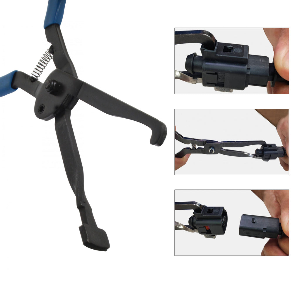 Клещите за демонтиране на автомобилни електрически съединители са предназначени за отключване на електрически свързващи блокове от разходомери, горивни инжектори, запалителни бобини и други подобни компоненти.