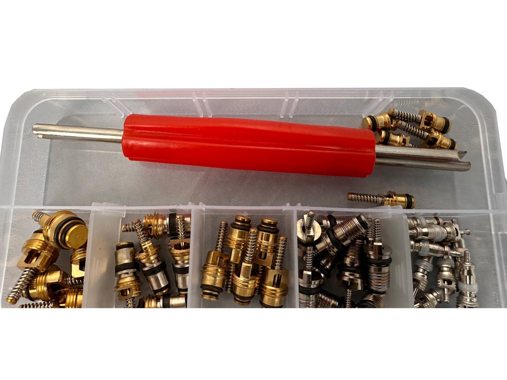 Този комплект вентили за климатик, 41 бр. GEBO TOOLS включва двустранна отвертка за разхлабване или затягане на вентила и 6 вида вентили.