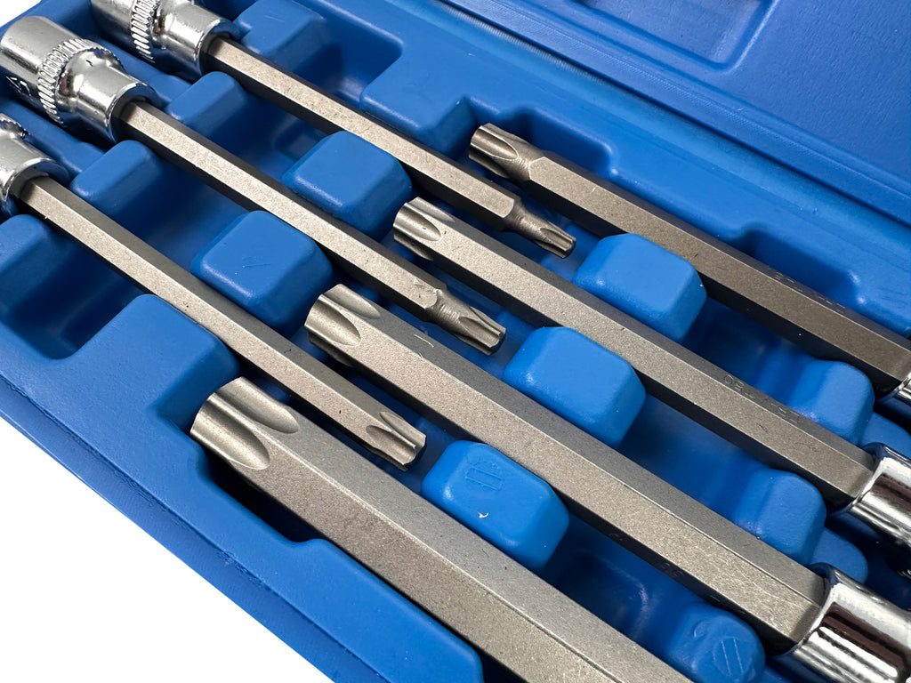 Комплектът вложки 3/8" удължени, 7 бр. торкс GEBO TOOLS е изработен от CR-V материал със следната производствена техника: матово покритие + набраздяване.