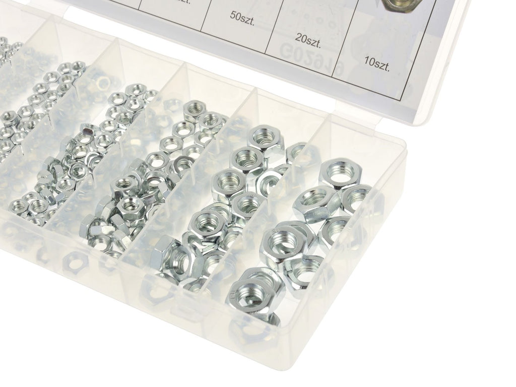 Този комплект гайки от неръждаема стомана 300 бр. GEKO се състои от 300 броя и включва гайки с размери M3, M4, M5, M6, M8 и M10. Комплектът съдържа 80 гайки M3, 70 гайки M4, 70 гайки M5, 50 гайки M6, 20 гайки M8 и 10 гайки M10.