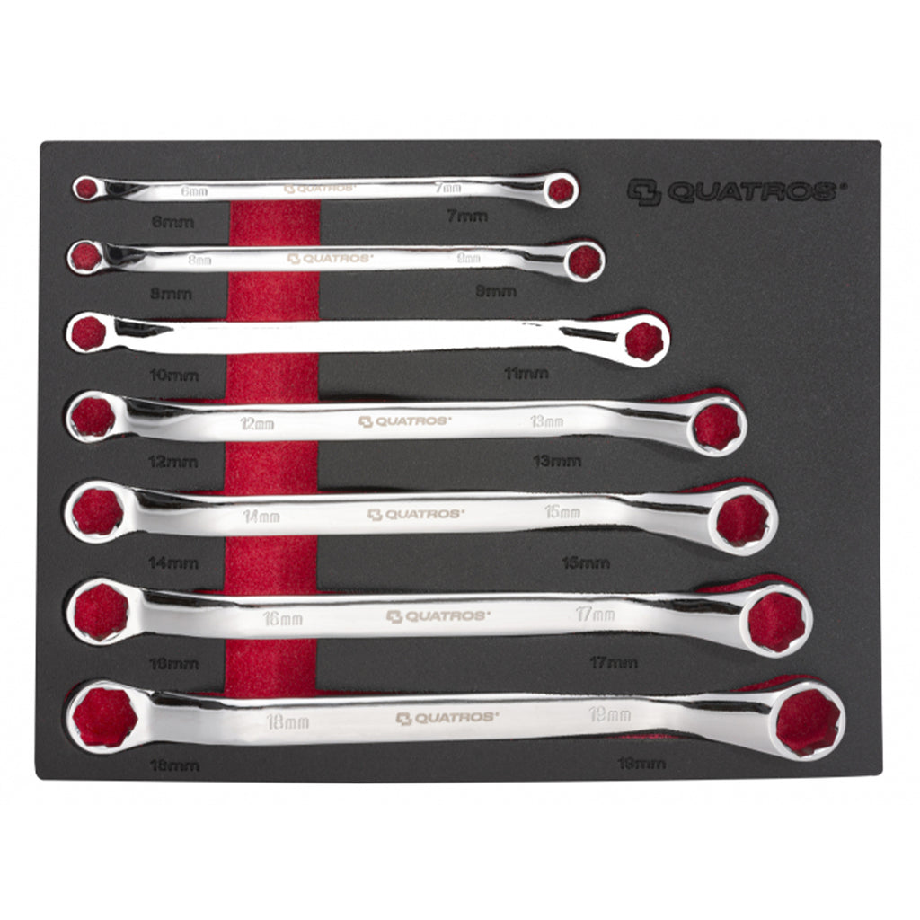 Комплектът включва размери 6x7 мм, 8x9 мм, 10x12 мм, 11x13 мм, 14x15 мм, 16x17 мм и 18x19 мм. Ключовете са изработени от хром-ванадиева стомана (Cr-V) и имат хромирана повърхност с огледално полирано покритие.