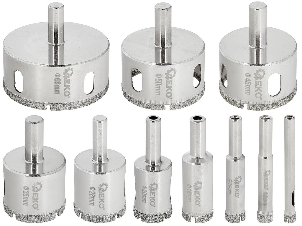 Комплектът включва размери 6 мм, 8 мм, 10 мм, 16 мм, 20 мм, 28 мм, 35 мм, 45 мм, 50 мм и 68 мм. Свредлата са устойчиви на износване и абразия, което ги прави подходящи за интензивна употреба както в сухи, така и в мокри условия.