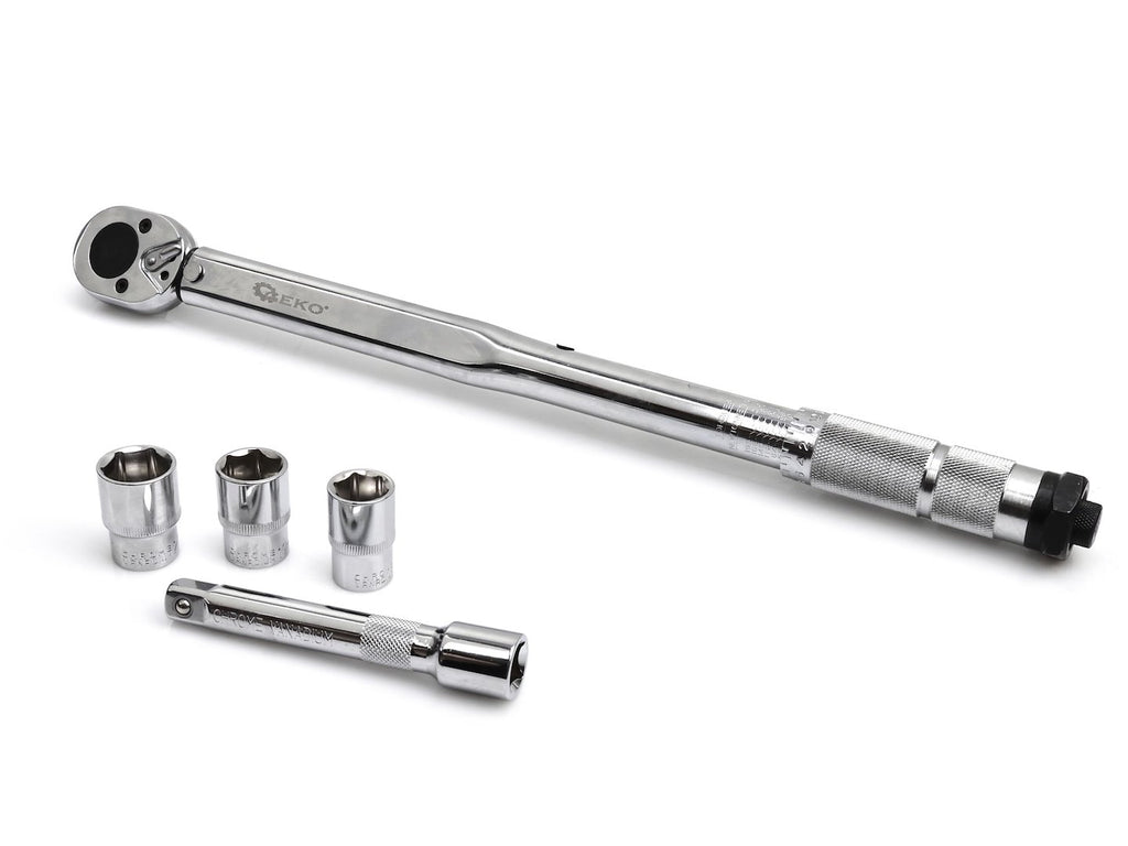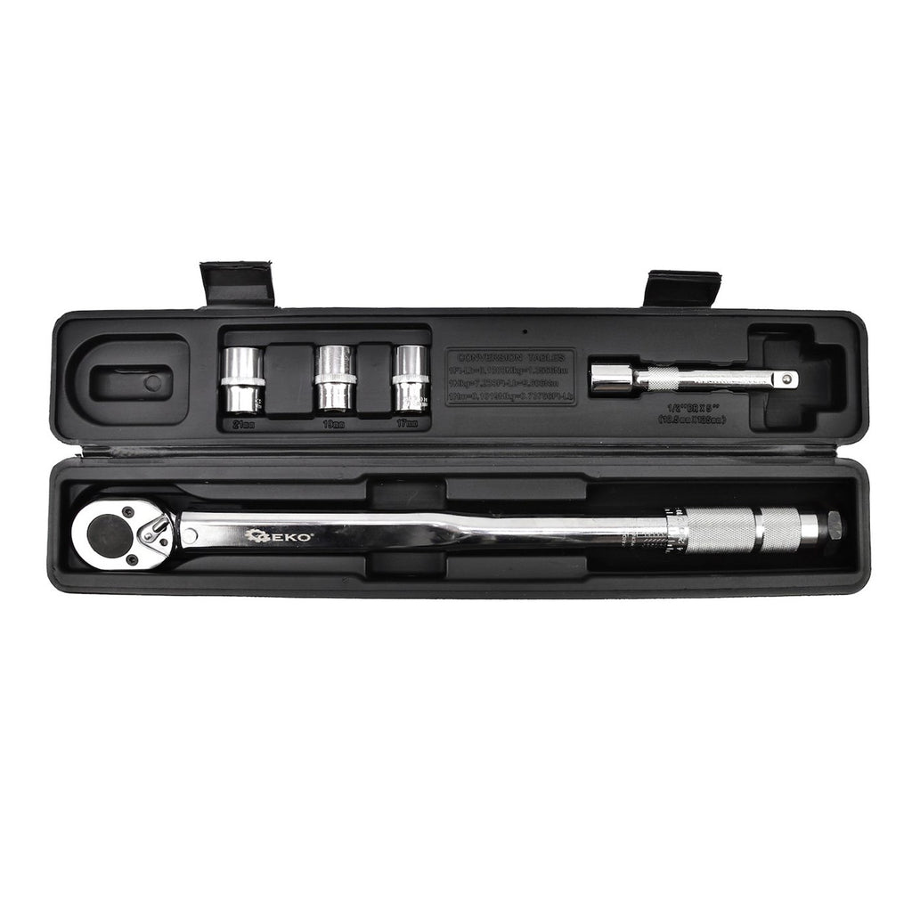 Този комплект динамометричен ключ 1/2" 28-210NM с вложки и удължител GEKO има диапазон на регулиране на въртящия момент между 28 и 210 Nm (2,9 - 21,4 KPS). Ключът е изработен от хром-ванадиева стомана (CrV) и има обща дължина 465 мм. Регулирането на въртящия момент се извършва с помощта на скала, гравирана върху дръжката, а зададената стойност се заключва с винт в основата на дръжката.