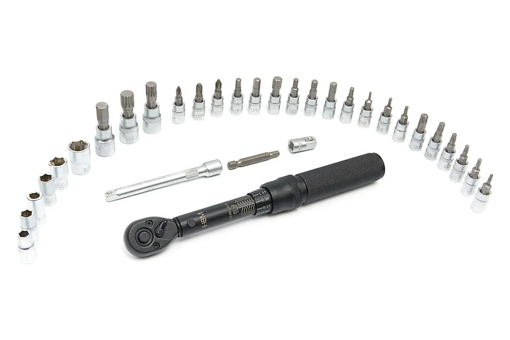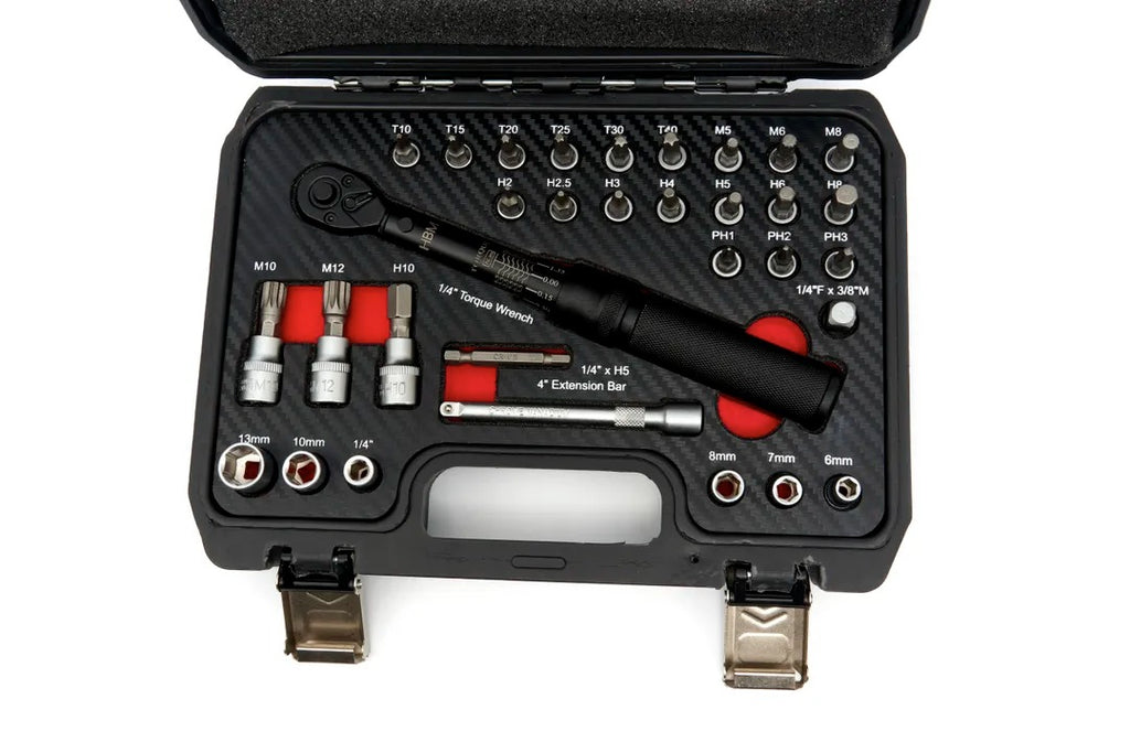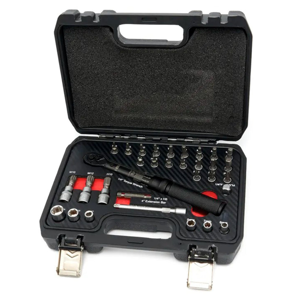 Комплектът включва 32 части, включително тръбни ключове 1/4" със стандартни метрични размери (от 6 до 13 мм), глави за отвертки PH, Torx, Imbus, както и гаечни ключове 3/8“ и адаптер от 1/4" към 3/8“. Включени са удължител 4", 50 мм дълга глава за битове H5 и 1/4“ x H5 глава за битове, покриващи широк спектър от приложения.
