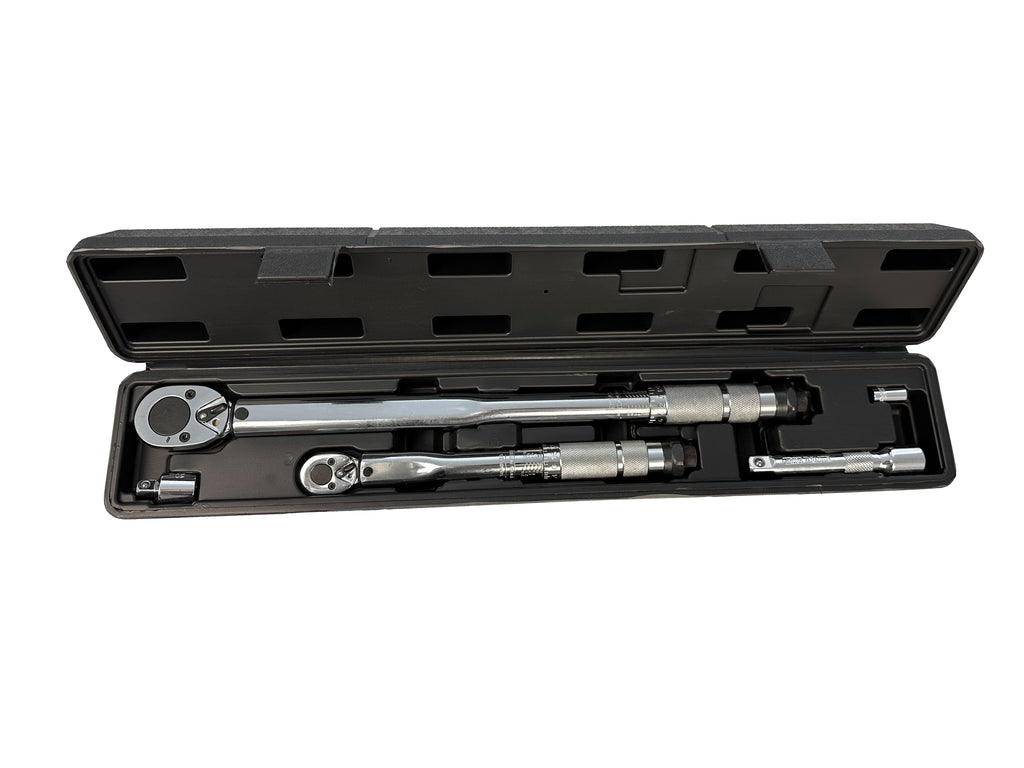 - Комплектът съдържа: 2 динамометрични ключа, 1 адаптер за битове и удължителен ключ