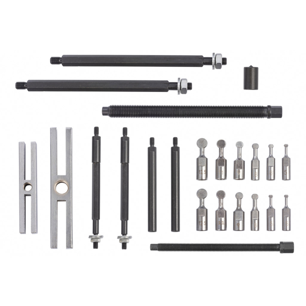 Комплектът екстрактор за лагери 5-12.5 мм 25 части е предназначен за изваждане на сачмени лагери чрез затягане на сферичните адаптери в лагерния пръстен. След като адаптерите са фиксирани на място, изваждачът позволява прецизно и безопасно изваждане.