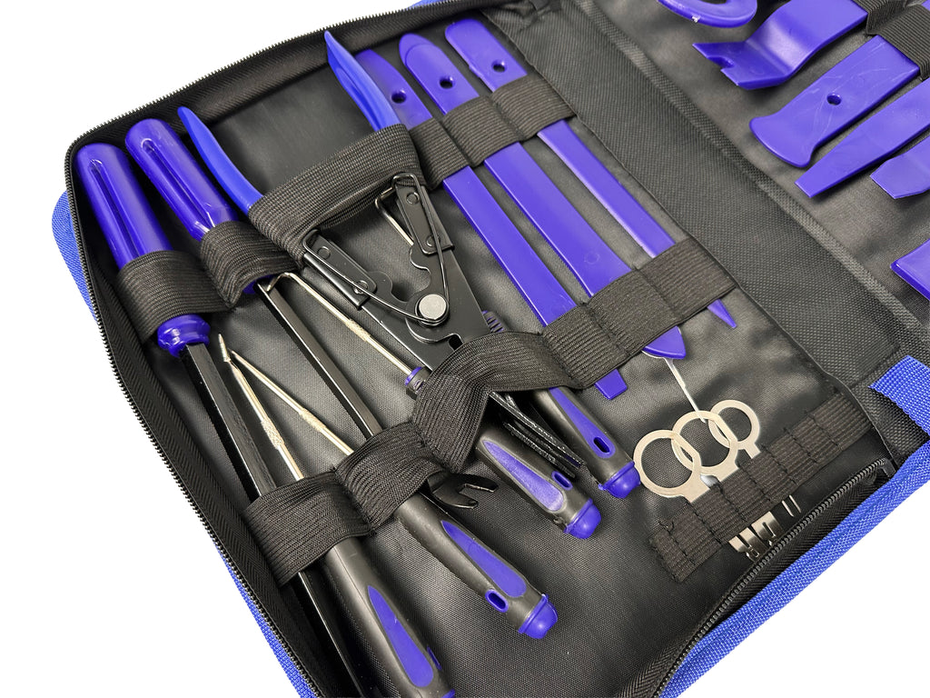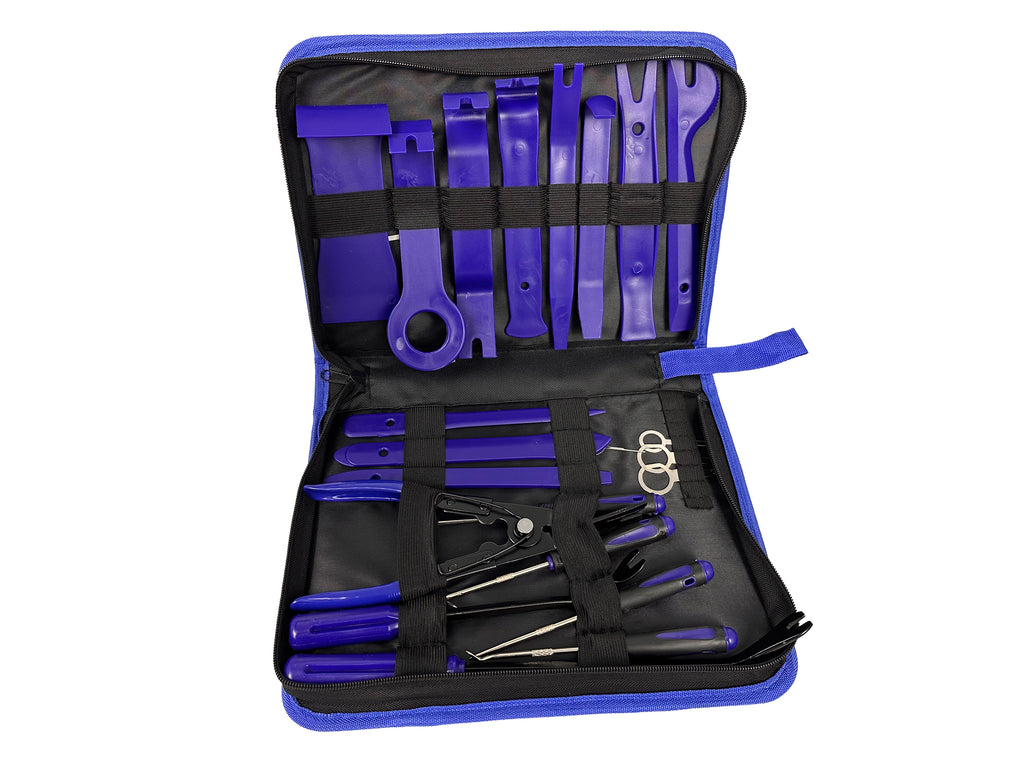 Комплектът за демонтаж на радио и тапицерии, щипки за кола, 23 части GEBO TOOLS е подходящ за демонтаж на панели, декоративни лайсни, превключватели, огледални лещи и стъкла. Много полезен и за труднодостъпни места.