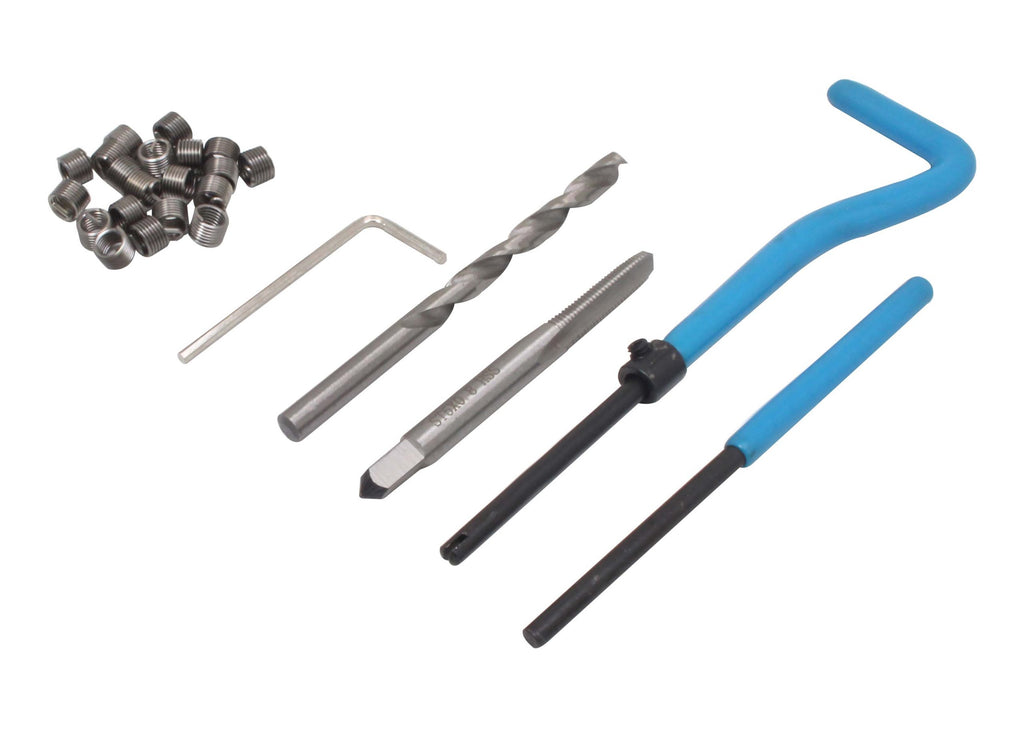 Комплектът съдържа 20 вложки с резба M5 x 0,8, HSS свредло за подготовка на отвора, HSS метчик за създаване на нова резба, монтажно устройство (дръжка/копче) и дорник за отстраняване на края на пружината след монтажа.