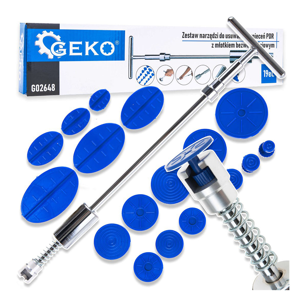 Комплектът за ремонт на щети от градушка GEKO е предназначен за ремонт на леки повреди по каросерията на автомобила, без да е необходимо пребоядисване. Инструментът използва плъзгащ се чук, който позволява контролирано изтегляне на металната повърхност до нейната първоначална форма. Накрайниците са безопасни за боята и не оставят следи по повърхността.