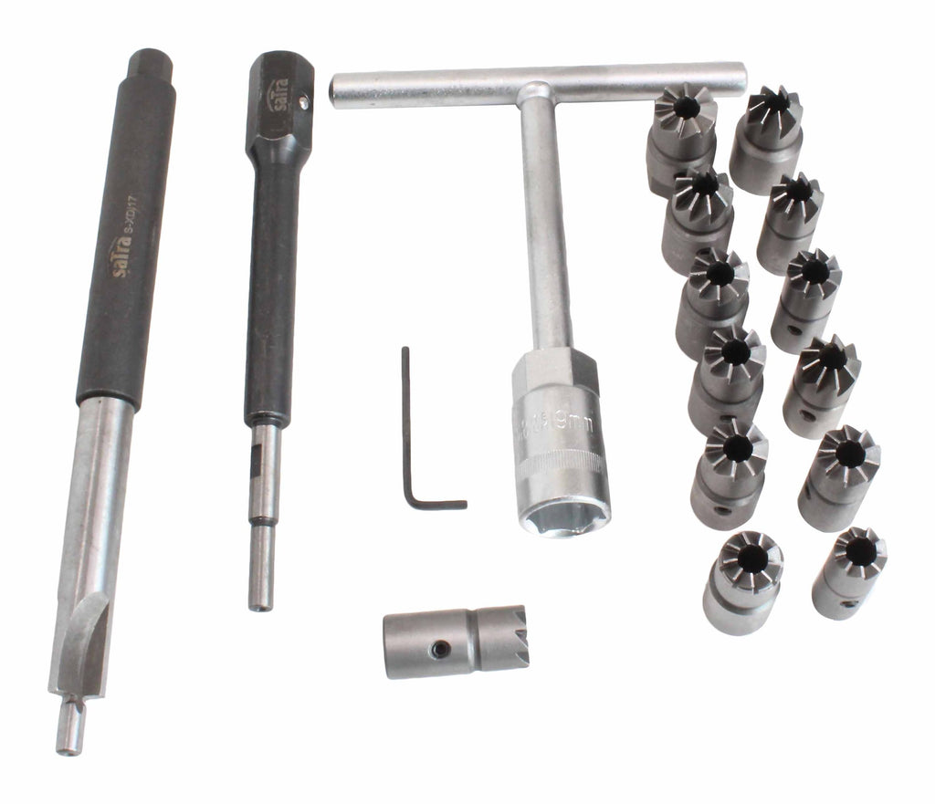 Комплектът фрези за почистване на отворите на седалката на инжектора, 17 броя, бързо и лесно премахва въглеродните отлагания от инжектора, позволявайки на инжектора да бъде фиксиран в спирачката. Този комплект се използва за повечето машини произведени след 2000.