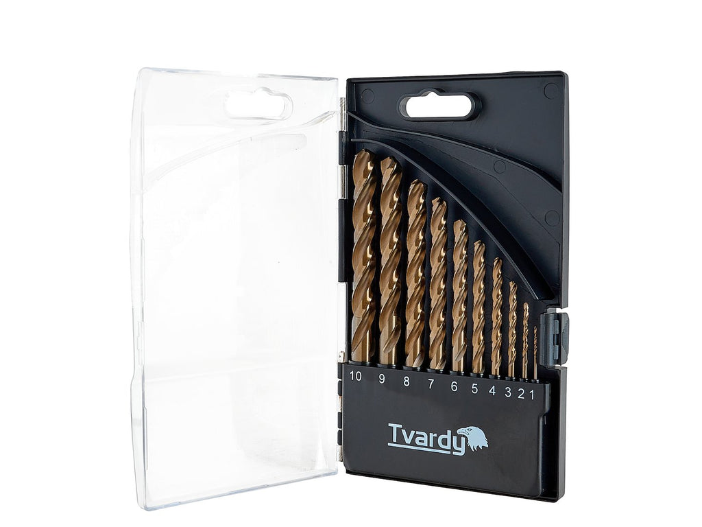 Този комплект кобалтови HSS свредла за метал 1-10 мм 10 бр. съдържа десет броя с диаметри от 1 до 10 мм. Кутията е маркирана за бързо разпознаване на размерите. Свредлата са изработени от високоскоростна стомана HSS M35 с 5% добавен кобалт, което им придава висока термоустойчивост и изключителна издръжливост при употреба върху неръждаема стомана, легирани стомани и други твърди метали. Стандартът е в съответствие с DIN 338.