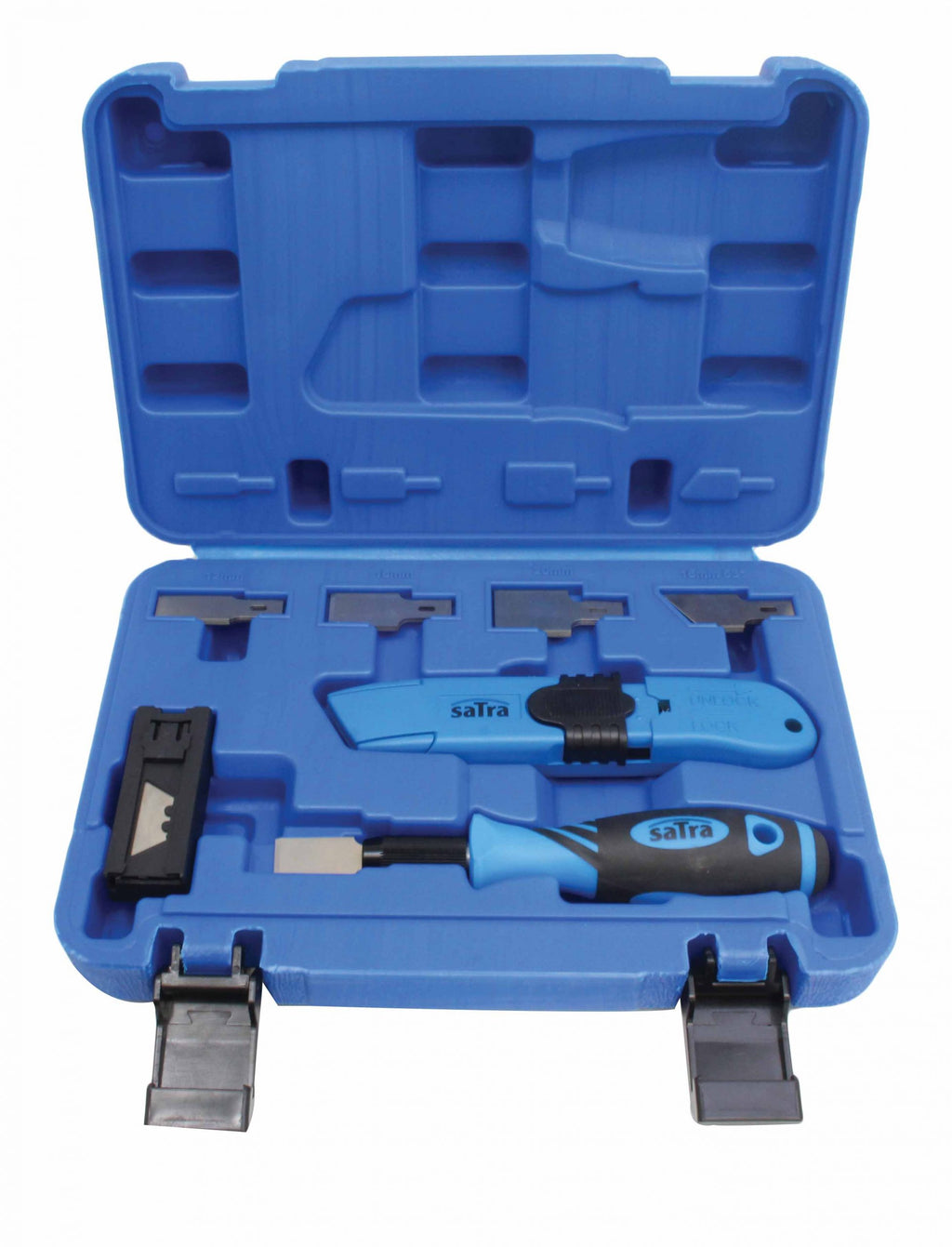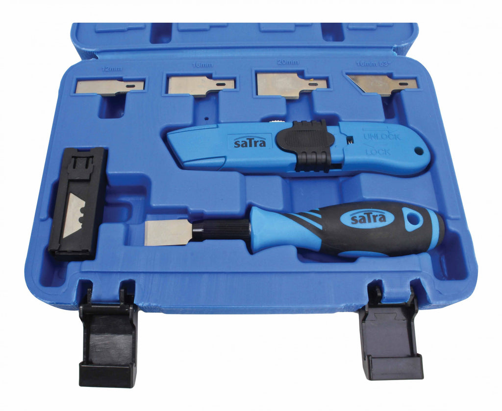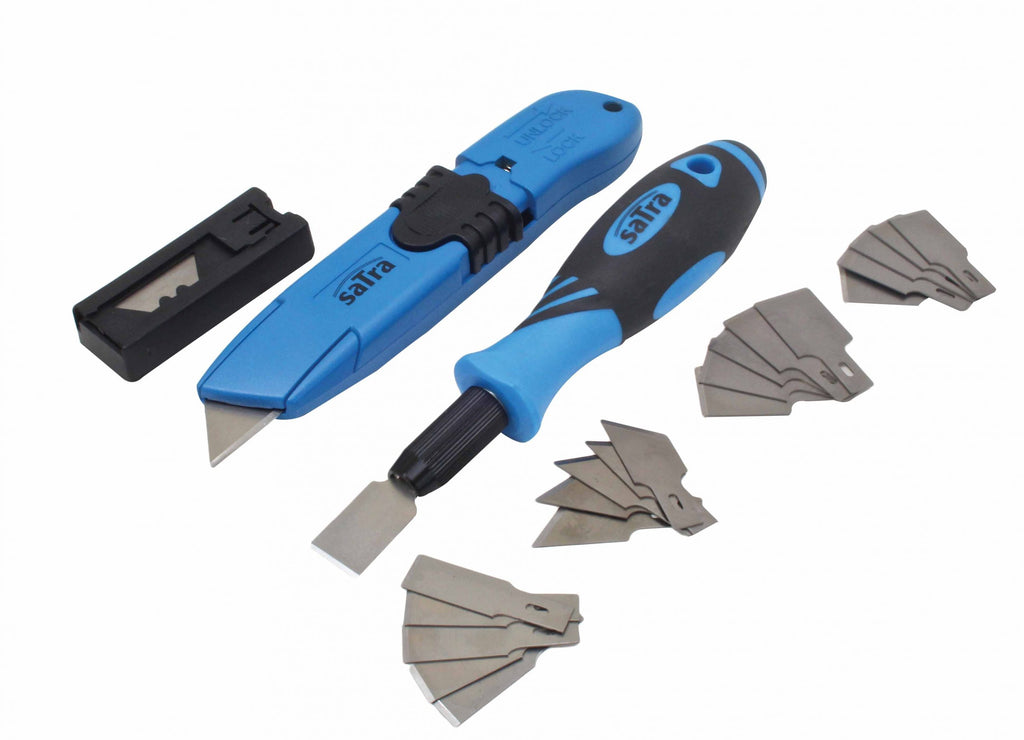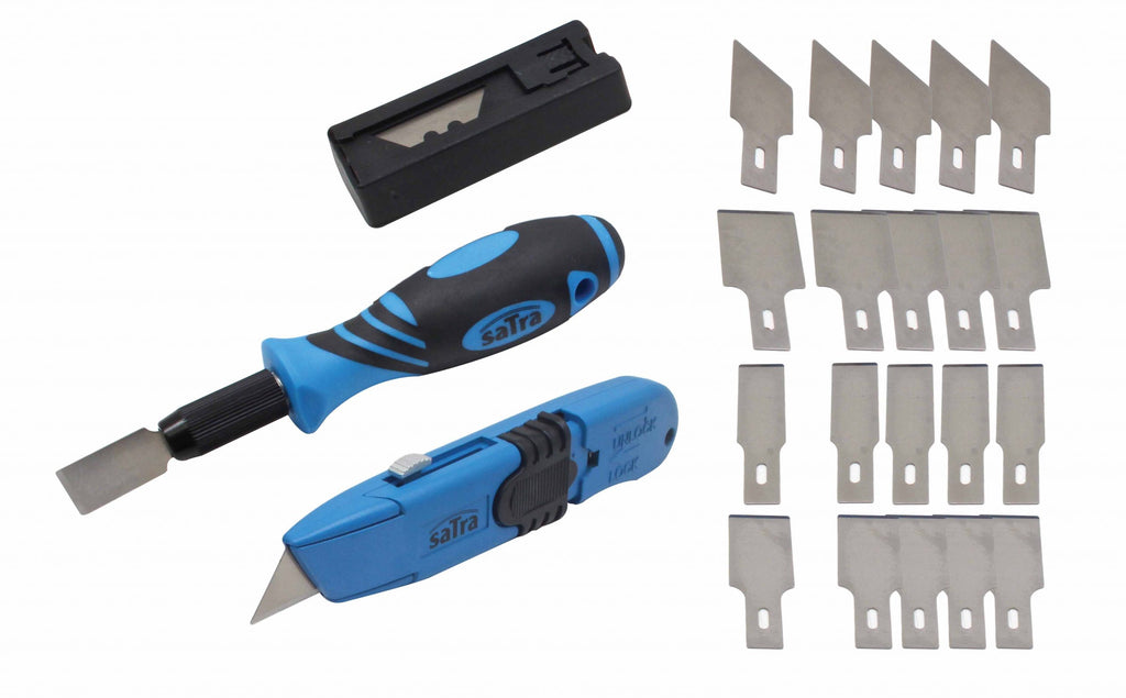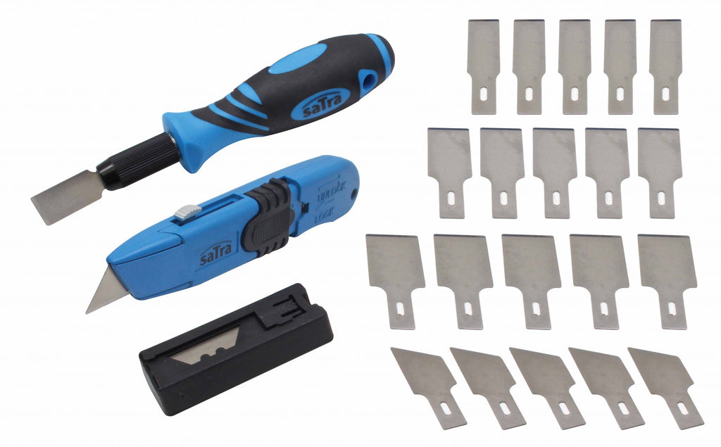 Комплектът стъргалка и ножче 30 части SATRA е предназначен за рязане и довършителни работи, което го прави подходящ както за професионалисти, така и за любители или за домашни задачи. Той съдържа метален нож с ергономична дръжка и 3-степенно удължаване на острието, скрепер с ергономична дръжка и бързо освобождаващ се държач на острието, контейнер за остриета и комплекти сменяеми остриета: 5 броя 12 мм, 6 броя 16 мм, 5 броя 20 мм и 5 броя 16 мм с 53° скосяване, както и 6 допълнителни остриета за нож.