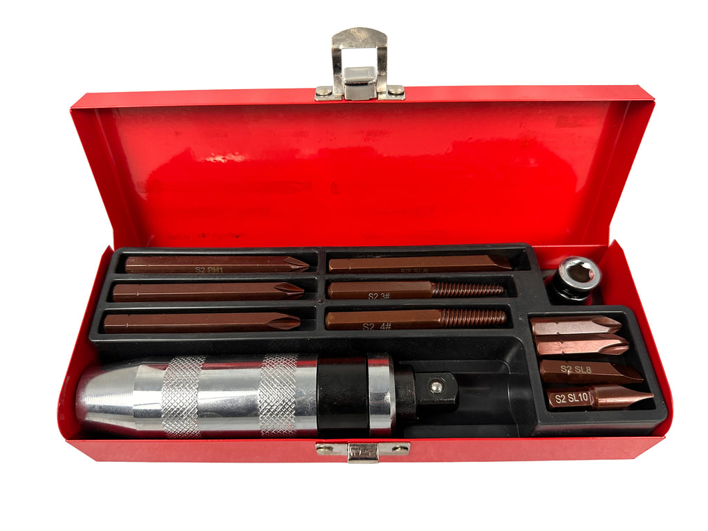 Комплектът ударна отвертка GEBO TOOLS се състои от 13 части. Идеален за разхлабване на винтове, превключвател ляво/дясно.