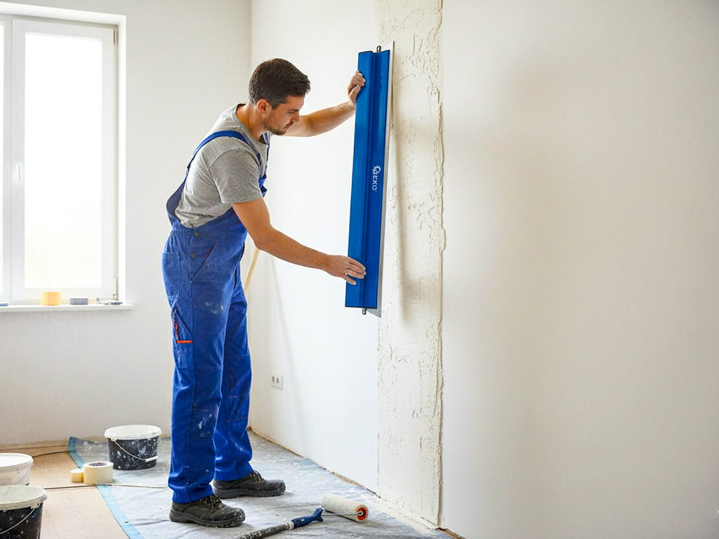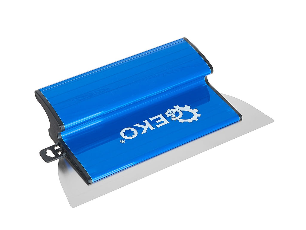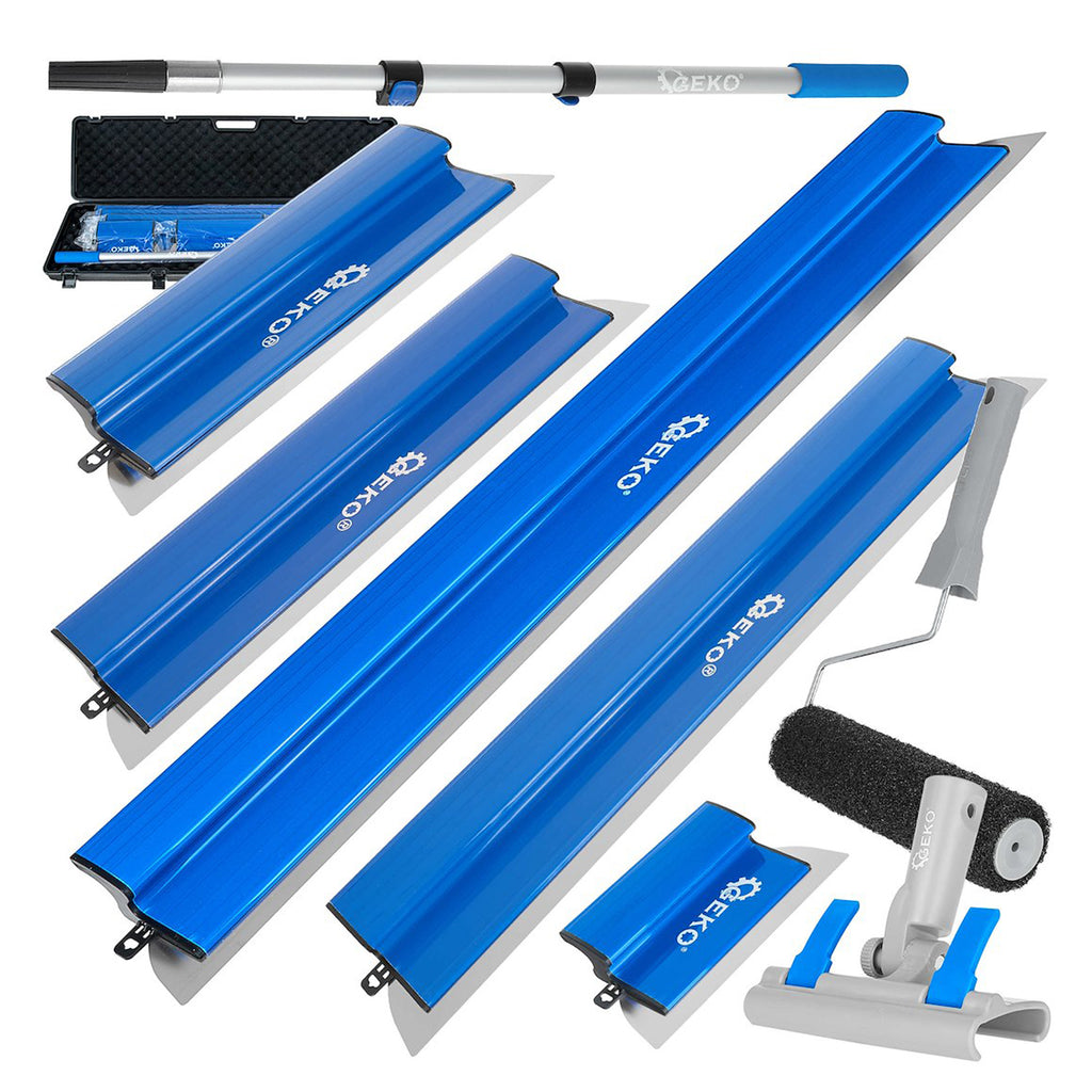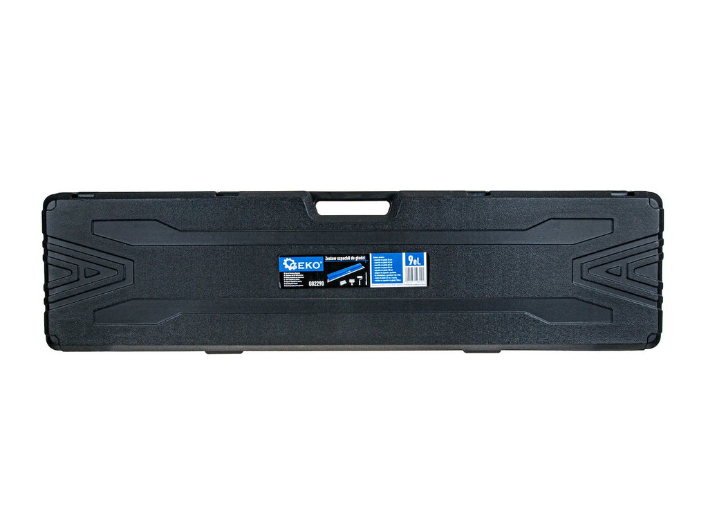 Този комплект шпакли за довършителни работи по стени и тавани 9 части GEKO се състои от 9 части и се доставя в твърда кутия с размери 120 x 32 x 12 см, оборудвана с пяна за защита. Комплектът включва шпакли за довършителни работи с ширина 25 см, 40 см, 60 см, 80 см и 100 см, изработени с пластмасова основа и сменяемо острие с дебелина 0,3 мм, предназначени за нанасяне и изглаждане на шпакловка.