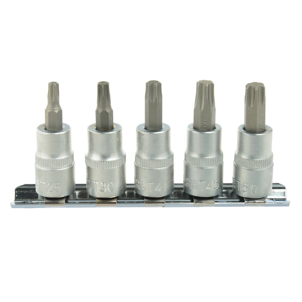 Този комплект 5 бита торкс T25-T50 3/8" CrV - GEKO е предназначен за затягане и разхлабване на TORX и звездообразни винтове в автомобилни и механични приложения. Комплектът съдържа 5 Torx бита с 3/8" квадратен привод, в размери T25, T30, T40, T45 и T50.