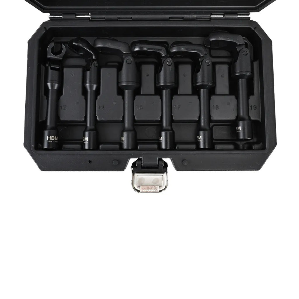 Комплектът 6 тръбни ключове 3/8 с шарнир за тръби 12-19 мм HBM съдържа елементи, изработени от хром-ванадиева стомана, и е проектиран с отворена главичка, която позволява затягане или разхлабване на гайки и болтове на труднодостъпни места, където не могат да се използват обикновени гаечни ключове. Те имат 3/8 инчови връзки и размери 12, 14, 16, 17, 18 и 19 мм.