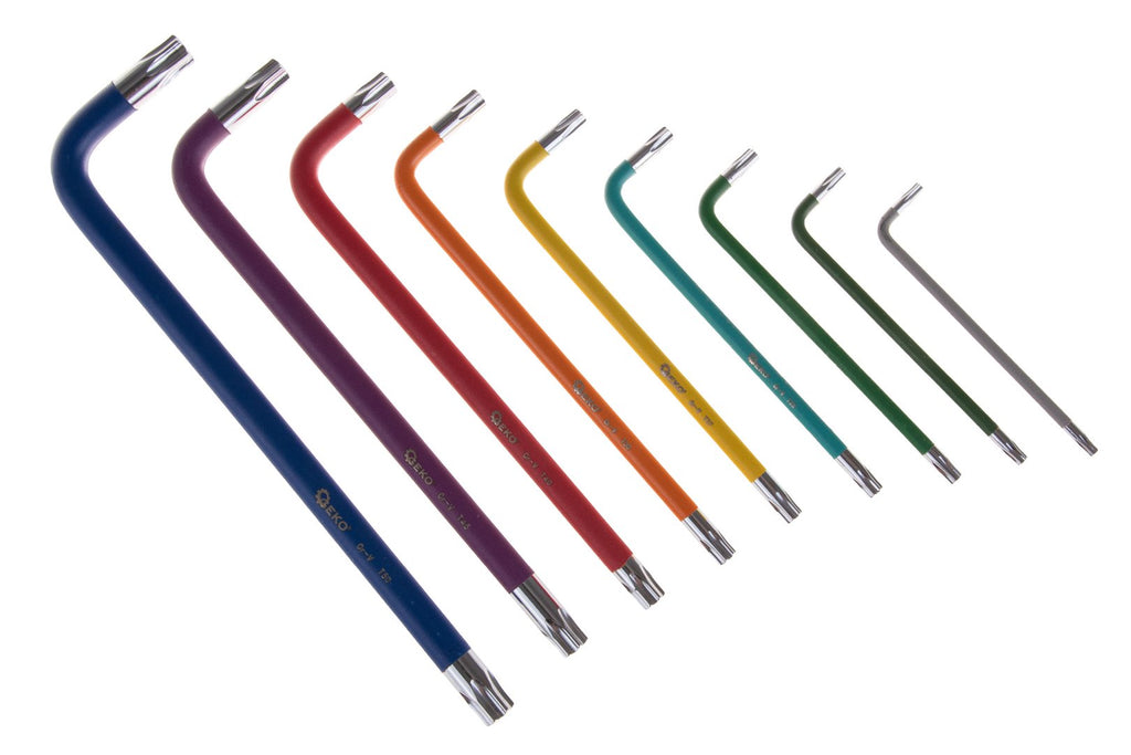 Този комплект 9 ключа торкс, тип L, цветни, Т10-Т50 GEKO е изработен от хромо-ванадиева стомана и включва ключове с размери от T10 до T50. Всеки ключ е обозначен с различен цвят за бързо разпознаване на размера, а именно T10 сив, T15 тъмнозелен, T20 зелен, T25 син, T27 жълт, T30 оранжев, T40 червен, T45 лилав и T50 тъмносин. Комплектът е предназначен за работа с винтове с Torx профил.