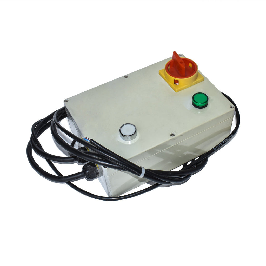 Контролен панел за 2-колонен подемник е изработен от метал и има бутон Старт / Стоп.