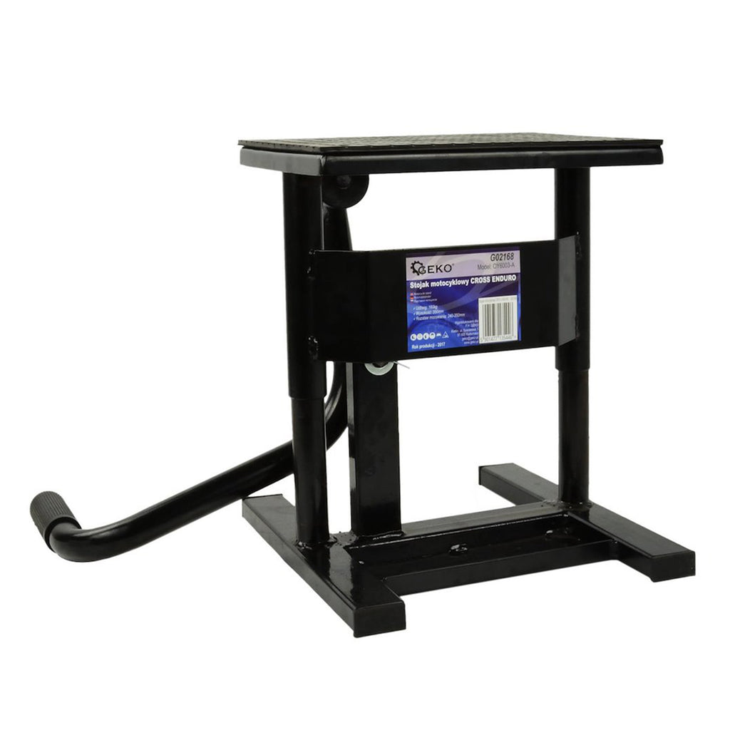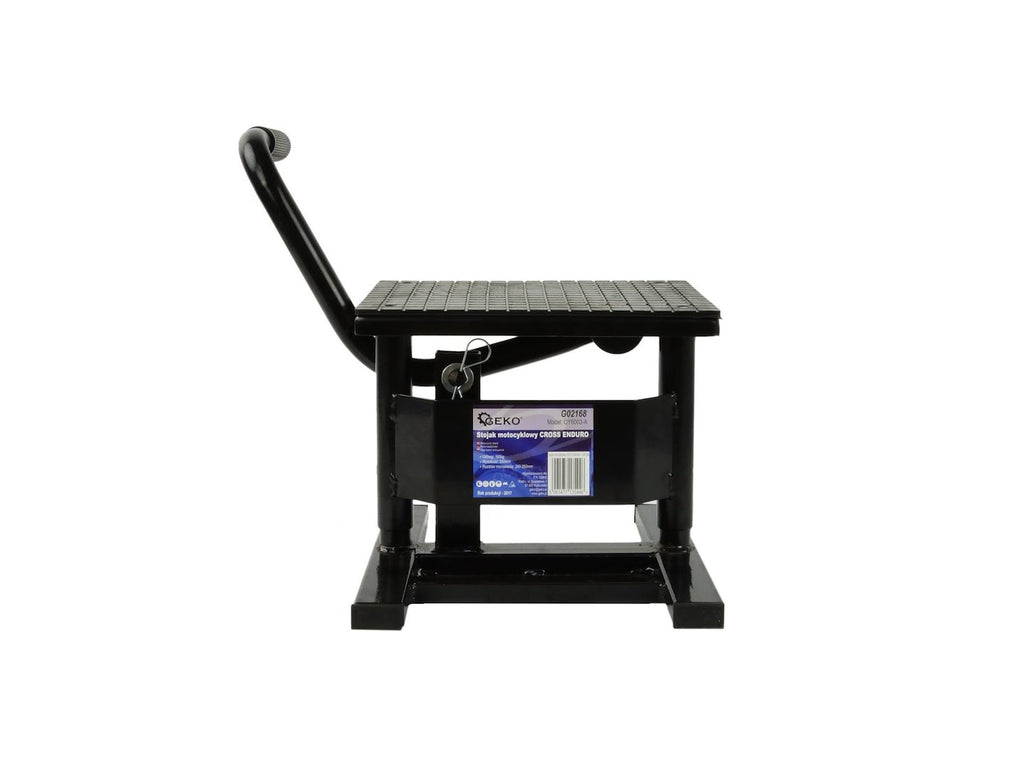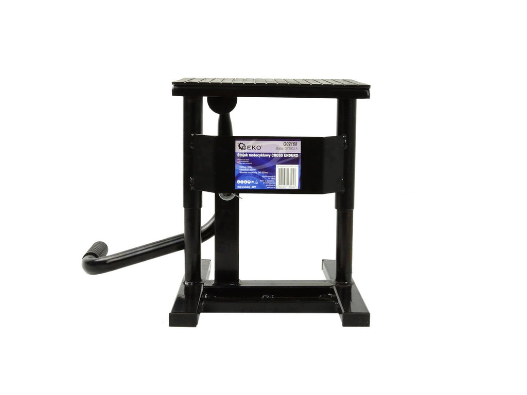 Крикът за повдигане на мотоциклети крос/ендуро, 160 кг GEKO е повдигаща опора, предназначена за мотоциклети от типа крос и ендуро. Тя позволява мотоциклетът да бъде повдигнат изцяло и е изработена от подсилена стомана, покрита с прахова боя. Повдигащата плоча е оборудвана с противоплъзгащ гумен слой. Работната височина е регулируема между 240 и 350 мм, а максималният товарен капацитет е 160 кг.