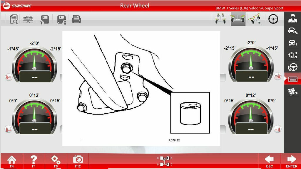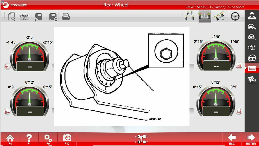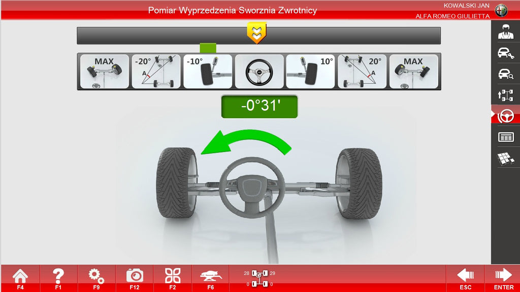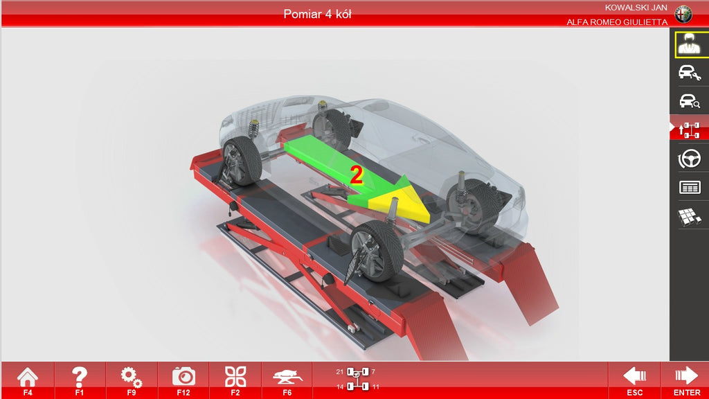 Програмата предлага функции за запазване на резултатите по време на повдигане на автомобила, както и възможност за регулиране на ъглите без колелото, с помощта на специални адаптери.