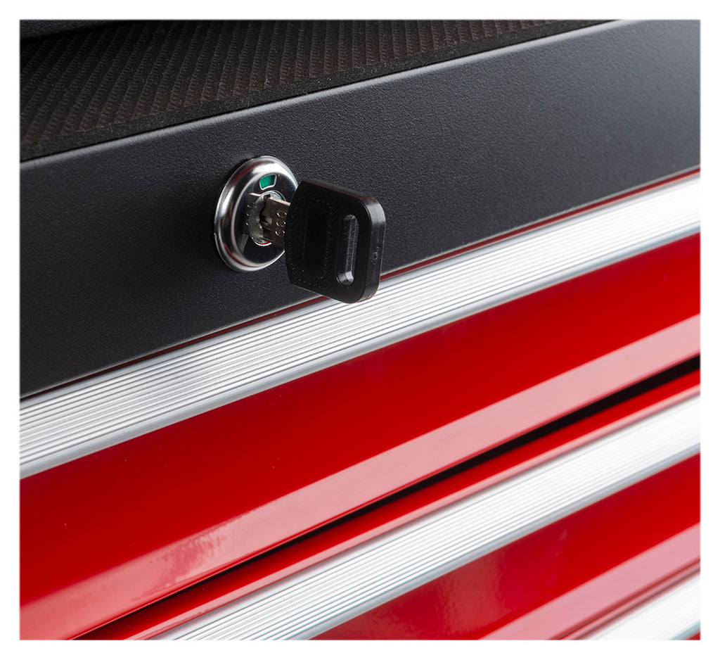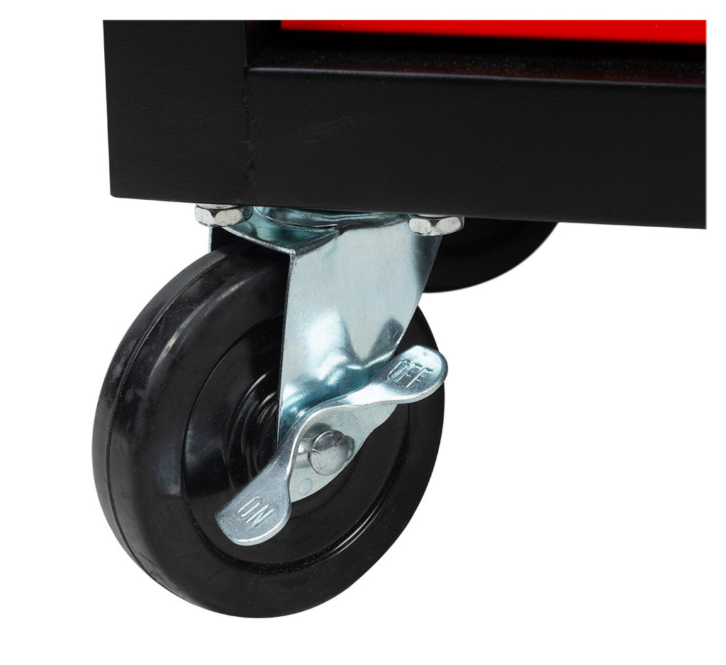 Вътрешната подложка от пяна осигурява допълнителна защита на инструментите и ги предпазва от изплъзване по време на пътуване. С компактните си размери от 620 мм ширина, 330 мм дълбочина и 785 мм височина шкафът спестява място, без да прави компромис с капацитета за съхранение. Оборудван е с четири големи колелца за по-голяма мобилност и централно заключване за защита на съдържанието. Идеален за професионални работилници или взискателни потребители, които искат ред и ефективност в работното си пространство.
