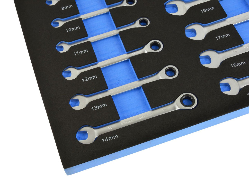 Този модул за шкаф с комбинирани ключове с тресчотка 8-22 мм 13 бр. GEKO съдържа елементи, изработени от кована хромо-ванадиева стомана, и е предназначен за интегриране в модулен шкаф за инструменти. Ключовете са оборудвани с пръстен с 72-зъбен механизъм, който позволява работа с крепежни елементи при минимален работен ъгъл от 5°. Отвореният край е наклонен под ъгъл 15°, което улеснява преместването на ключа в тесни пространства. Профилът на задвижването е проектиран така, че да намалява износването на ъглите на болтовете и гайките. Модулът съдържа гаечни ключове с размери от 8 мм до 22 мм.