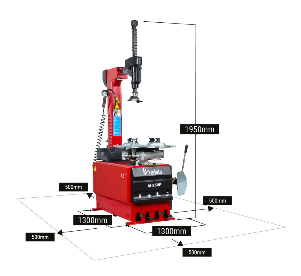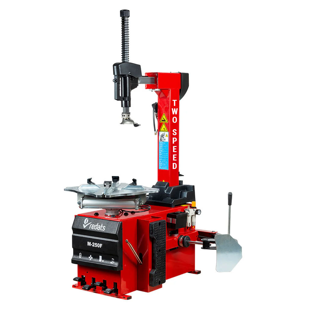 Монтажната машина за гуми с 2 скорости и автоматично рамо 26" 230V M-250F REDATS е автоматична машина за демонтаж и монтаж на гуми, захранвана от 230 V. Позволява работа с големи колела, с капацитет на затягане на вътрешната джанта между 14 и 26 инча и капацитет на затягане на външната джанта между 12 и 23 инча. Максималният диаметър на колелото е 1143 мм, а максималната широчина - 406 мм. Машината е оборудвана с двускоростен двигател с мощност от 0,75 kW на първа предавка и 1,1 kW на втора предавка, а скоростта на въртене на платформата може да се регулира между 6 и 12 оборота в минута. Максималният въртящ момент е 1078 Nm.