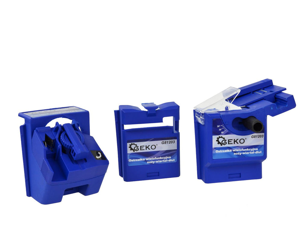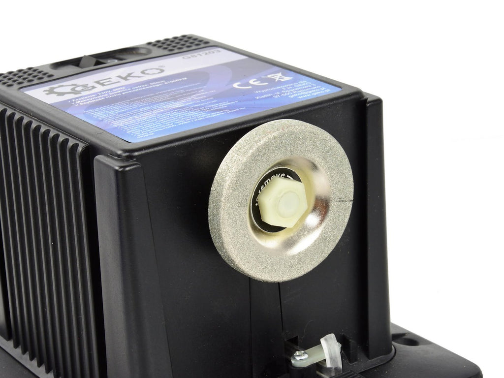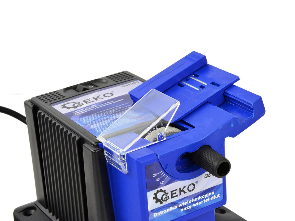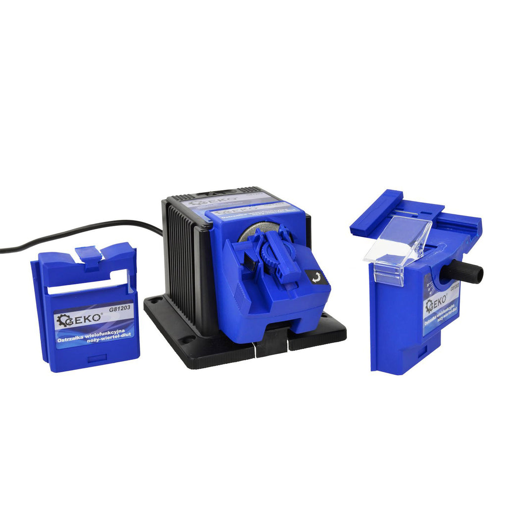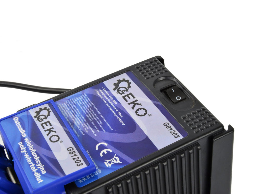 Тази мултифункционална машина за заточване на ножове, свредла и длета GEKO е оборудвана с отделни приставки за HSS борконци, длета и рендосани остриета, както и за ножове и ножици. Моторът има номинална мощност 65 W и работи при напрежение 230 V / 50 Hz. Скоростта на празен ход е 6700 об/мин.