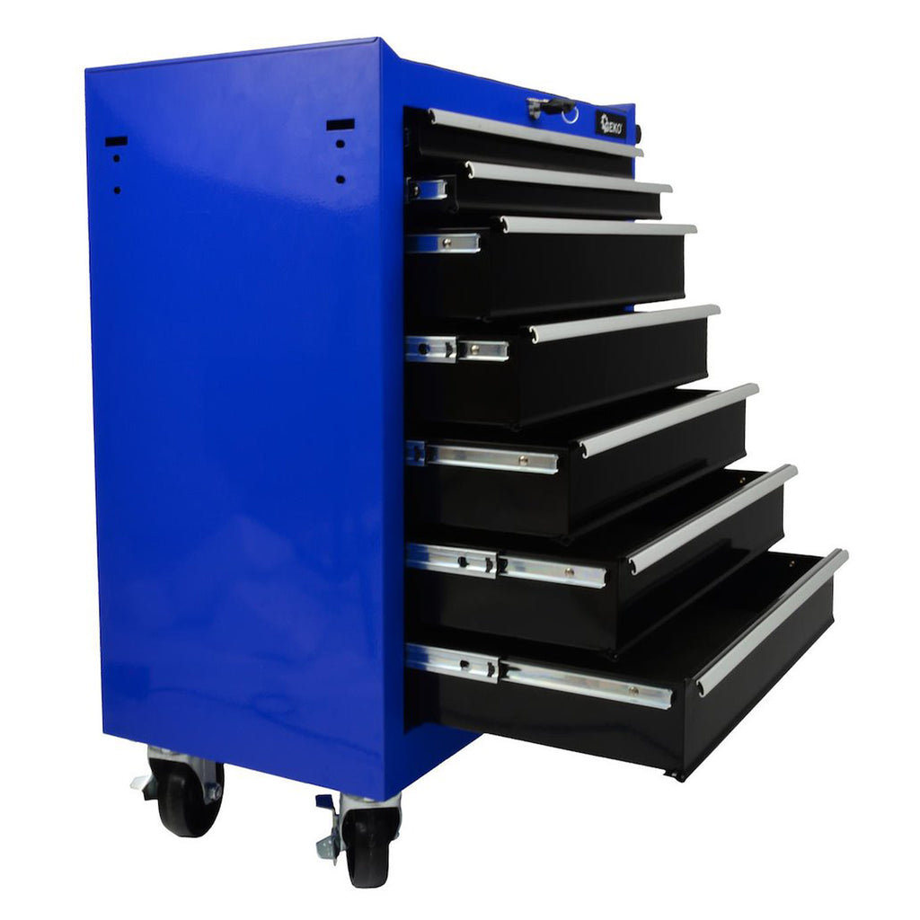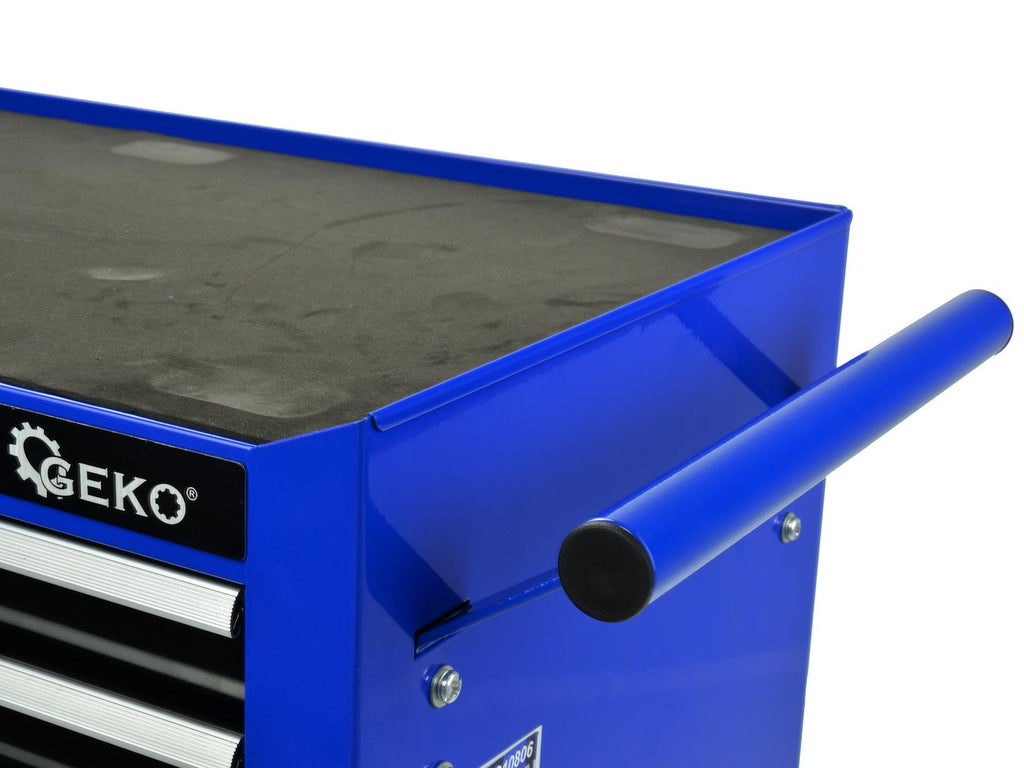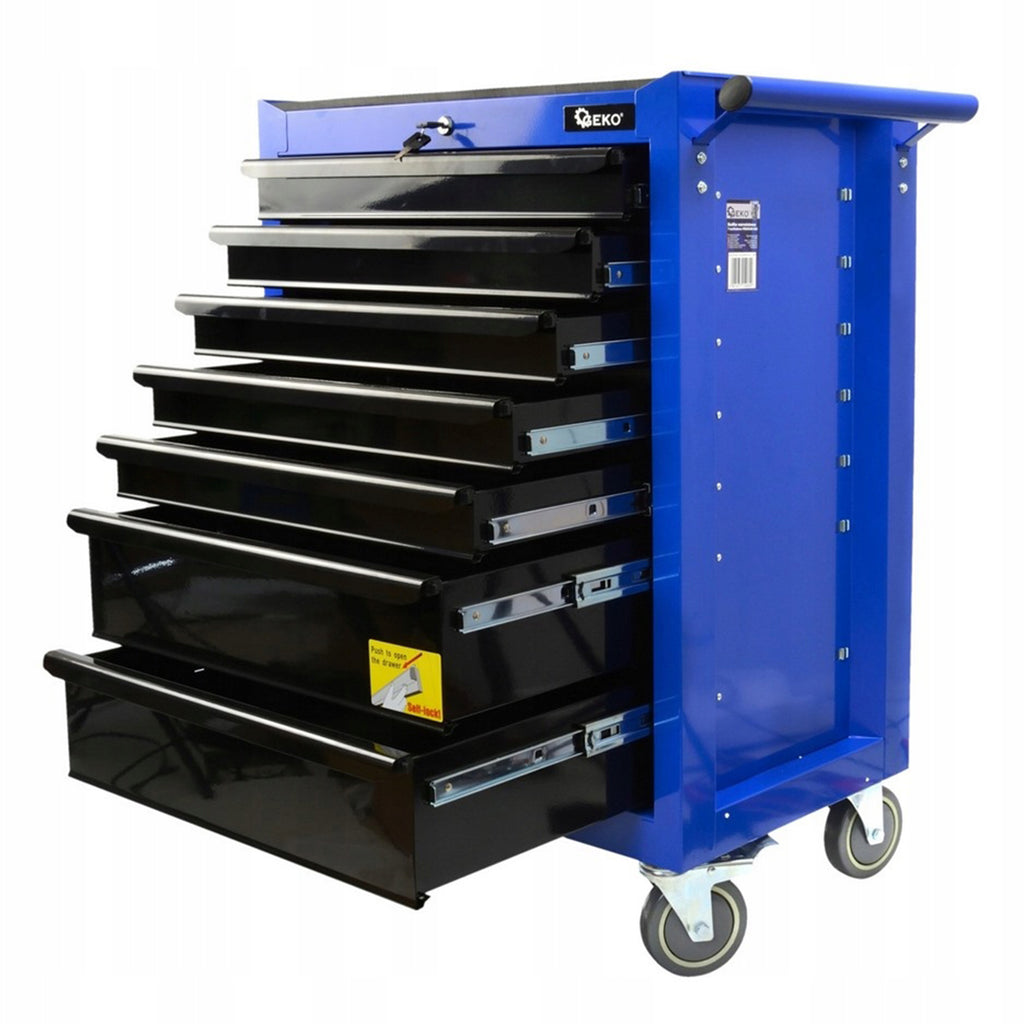 Този необорудван метален шкаф за инструменти с 7 чекмеджета GEKO е предназначен за организиране и съхранение на инструменти в работилници, сервизни центрове и гаражи. Шкафът е с метална конструкция и е оборудван с централизирана заключваща система с ключ, която заключва едновременно и седемте чекмеджета. Общите размери на шкафа са 775 x 695 x 335 мм, височината без колела е 660 мм, а ширината без дръжки е 620 мм.