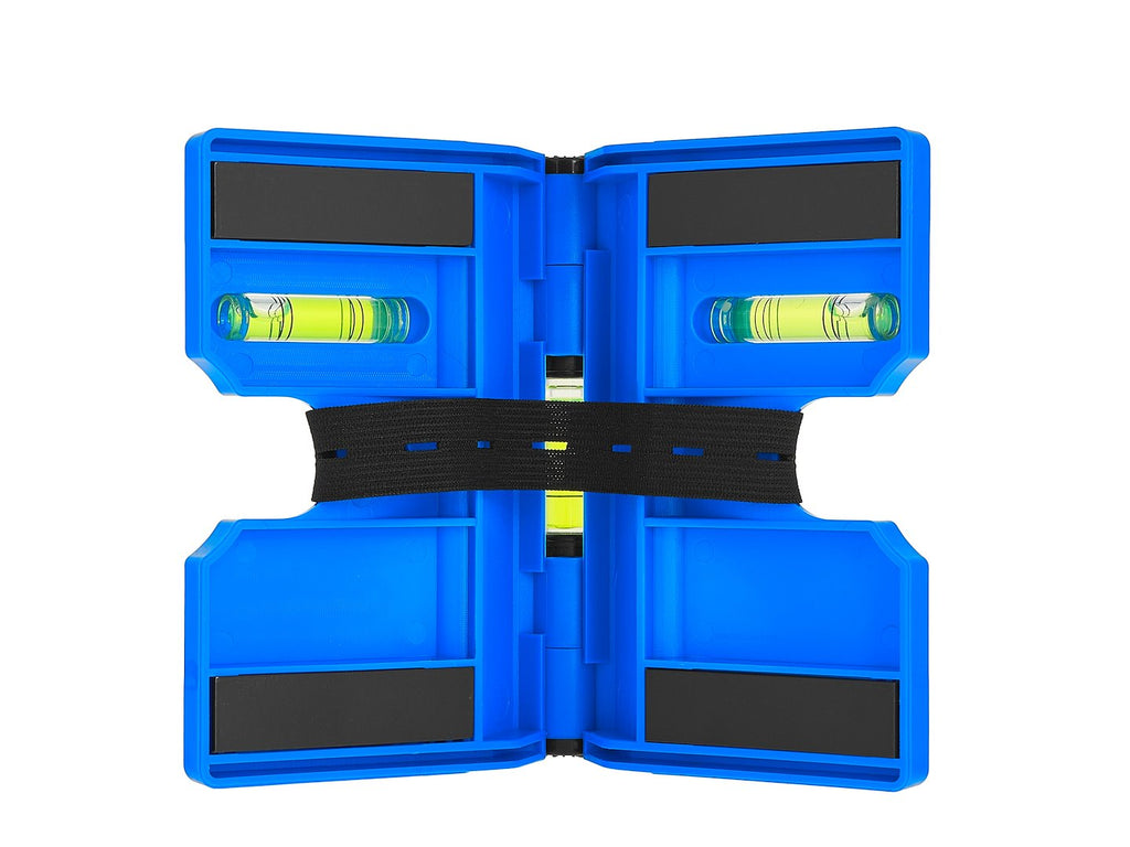 Този нивелир за ъгли с 3 мехура с магнит е инструмент, предназначен за изравняване на стълбове, метални профили и конструктивни елементи. Нивелирът има специален дизайн за ъгли, който позволява едновременно изравняване да се проверява в няколко равнини. Той е оборудван с вградени магнити за закрепване към метални повърхности и регулируема еластична лента за закрепване към стълбове с различни напречни сечения. Корпусът е изработен от издръжлива пластмаса, а балончетата са четливи за отчитане на вертикалната и хоризонталната позиция.