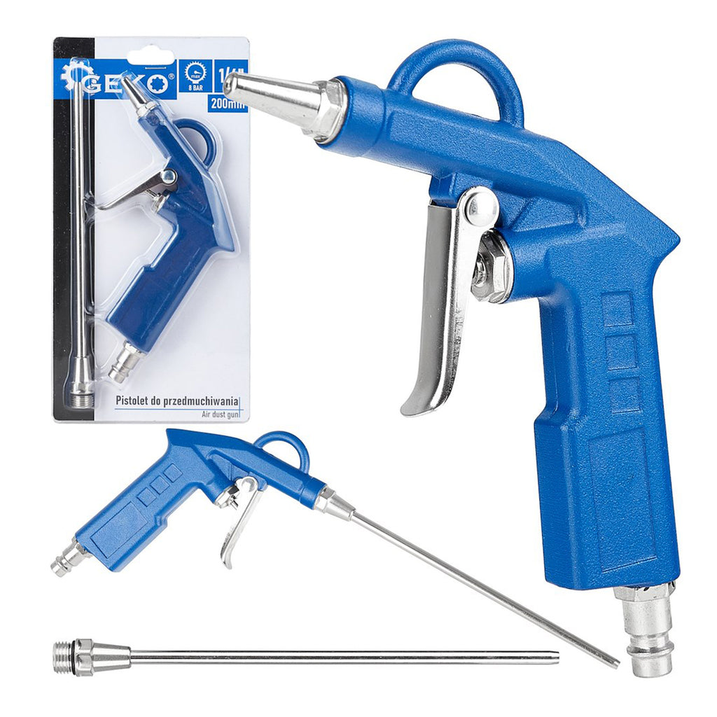 Този пистолет за обдухване с 2 дюзи GEKO има две сменяеми дюзи. Късата дюза е подходяща за прецизно и локализирано духане, докато дюзата с дължина 20 см улеснява достъпа до труднодостъпни места. Максималното допустимо налягане е 8 bar. Стандартният 1/4" вход за въздух го прави съвместим с повечето налични компресори.