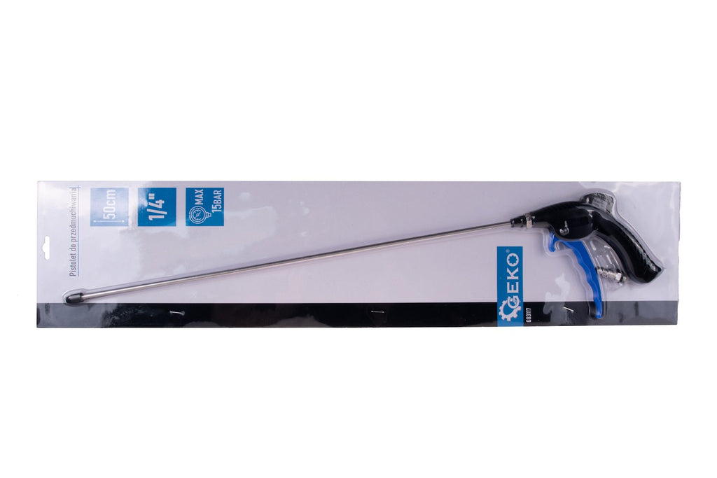 Този пистолет за сгъстен въздух с дюза 50 см и 1/4" бързо съединение - GEKO е предназначен за обдухване и почистване със сгъстен въздух в работилница или за общоприложно използване. Той е оборудван с 50 см дълга стоманена дюза, която позволява прецизно насочване на въздушния струя и достъп до труднодостъпни места. Пистолетът е оборудван с 1/4" бързо съединение, съвместимо с повечето стандартни пневматични системи.
