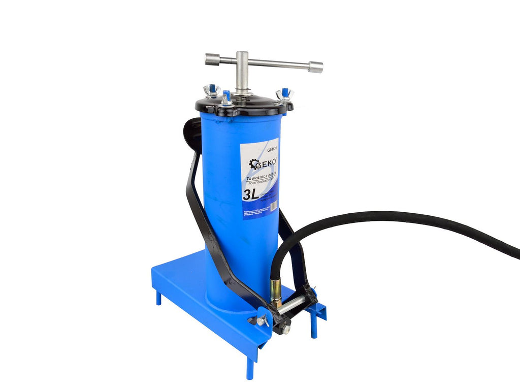 Тази помпа за гресиране 3 л с маркуч 4 м GEKO е гресова помпа, оборудвана с пистолетна ръкохватка, снабдена с 22 см гумен маркуч, завършващ с гресова муфа и задействана с педал. Конструкцията включва стоманена капачка на барела и 3-литров стоманен контейнер. Помпата развива работно налягане от 20 MPa, с максимално налягане от 30 MPa, и осигурява дебит от 3 г грес на ход. Оборудвана е с гумен маркуч за високо налягане.