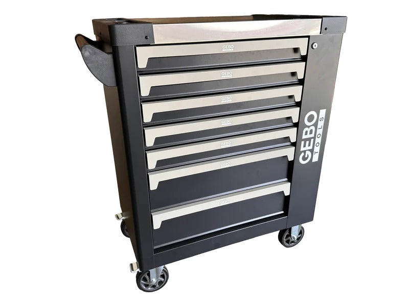 Този професионален шкаф с инструменти с 7 чекмеджета, 7 карбонови модула и 262 части GEBO TOOLS е предназначен за употреба в автосервизи, гаражи и професионални пространства, осигурявайки ефективна организация и бърз достъп до пълен комплект инструменти. Шкафът е оборудван със 7 чекмеджета, система за плъзгане с лагери, централно заключване и възможност за индивидуално заключване на всяко чекмедже.