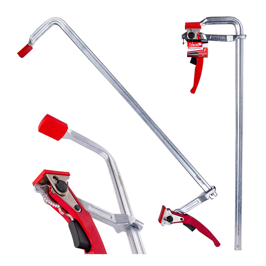 Тази скоба менгеме за дърводелство с тресчотка 600x120 мм е предназначена за закрепване на дървени части по време на рязане, лепене или сглобяване. Изработена е от кована стомана и е покрита с защитен хромов слой за предпазване от корозия. Осигурява сила на затягане до 500 кг. Максималното отваряне е 600 мм, а дълбочината е 120 мм. Оборудвана е с пластмасови предпазители, за да се предотврати повреда на повърхностите на затегнатите материали. Системата с тресчотка позволява затягане и регулиране с една ръка.
