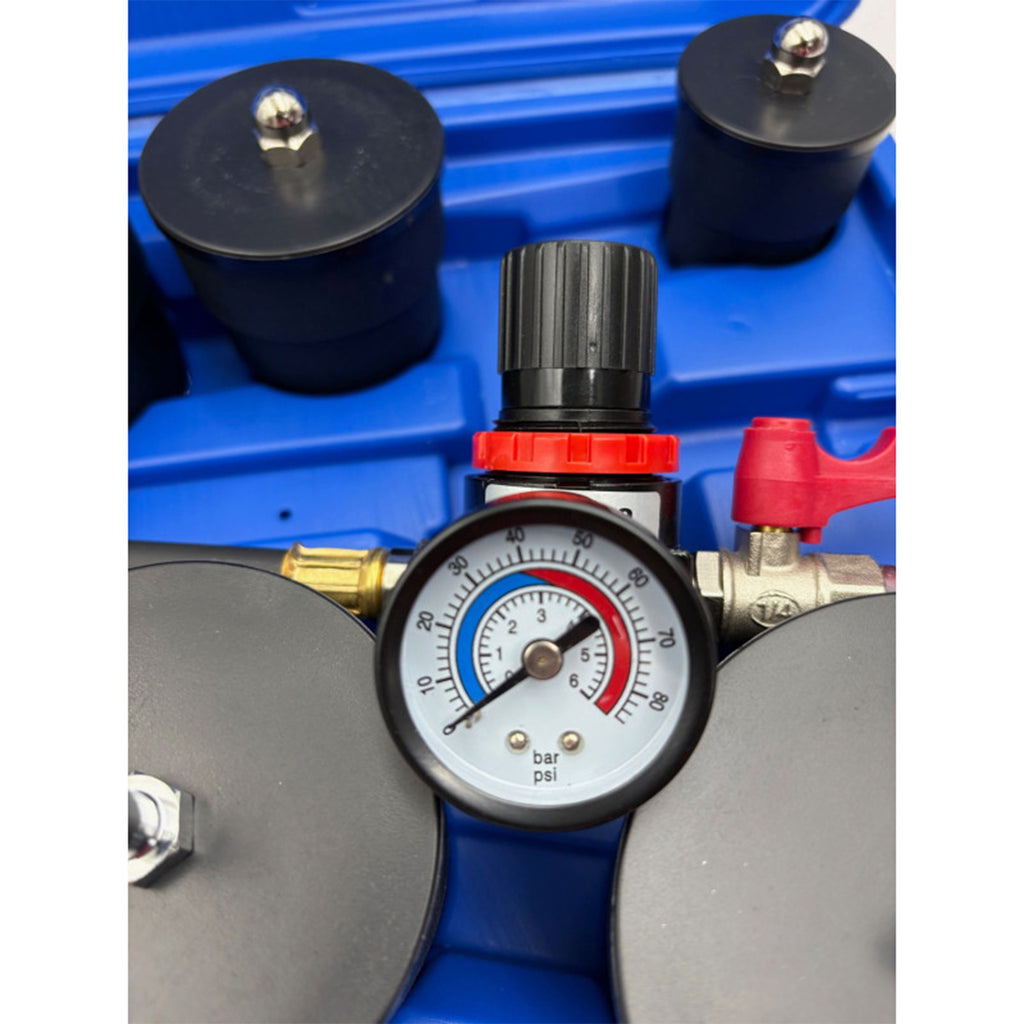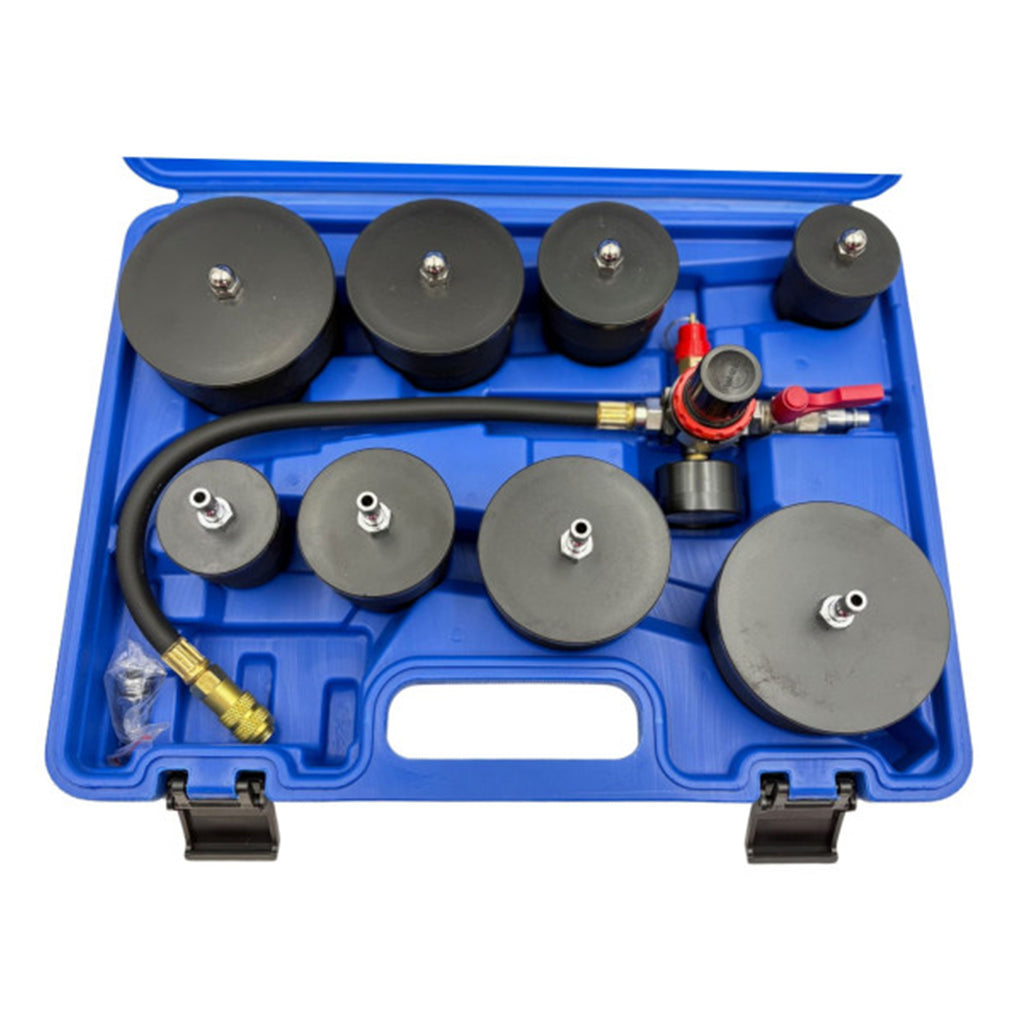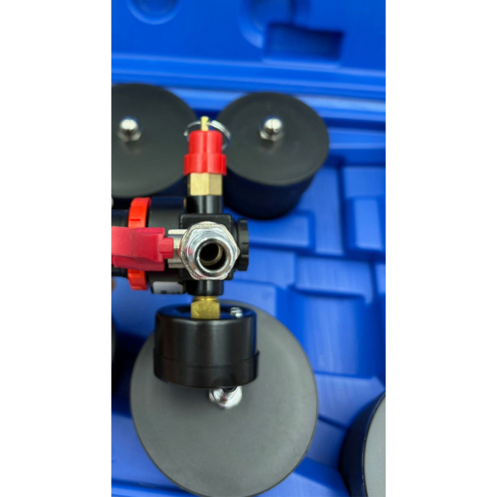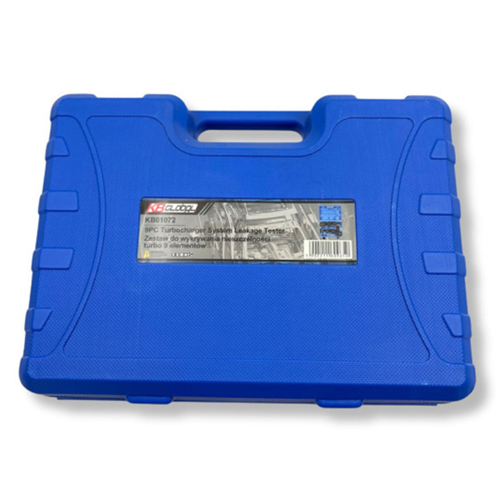 Този тестер за налягане и течове за турбокомпресор 9 броя - KB GLOBAL е предназначен за проверка на течове и откриване на загуби на налягане в системи за суперзареждане и охлаждане. Тестерът се използва в комбинация с линия за сгъстен въздух и е оборудван с манометър, снабден с изключвателен вентил и вентил за изпускане на въздух за контрол на налягането по време на тестването.