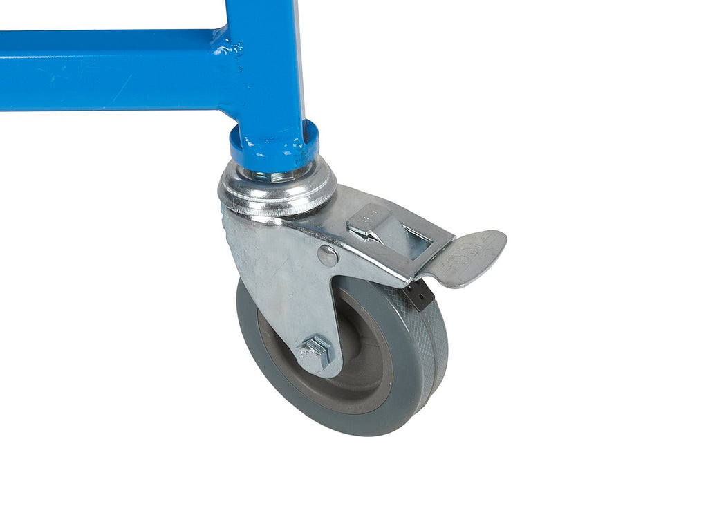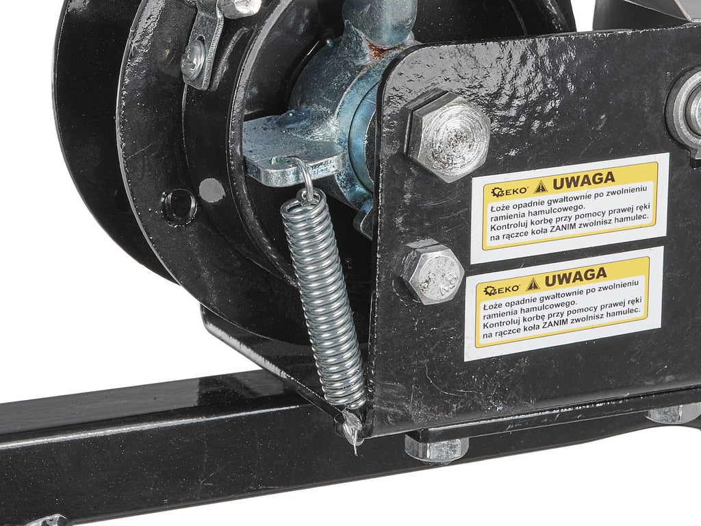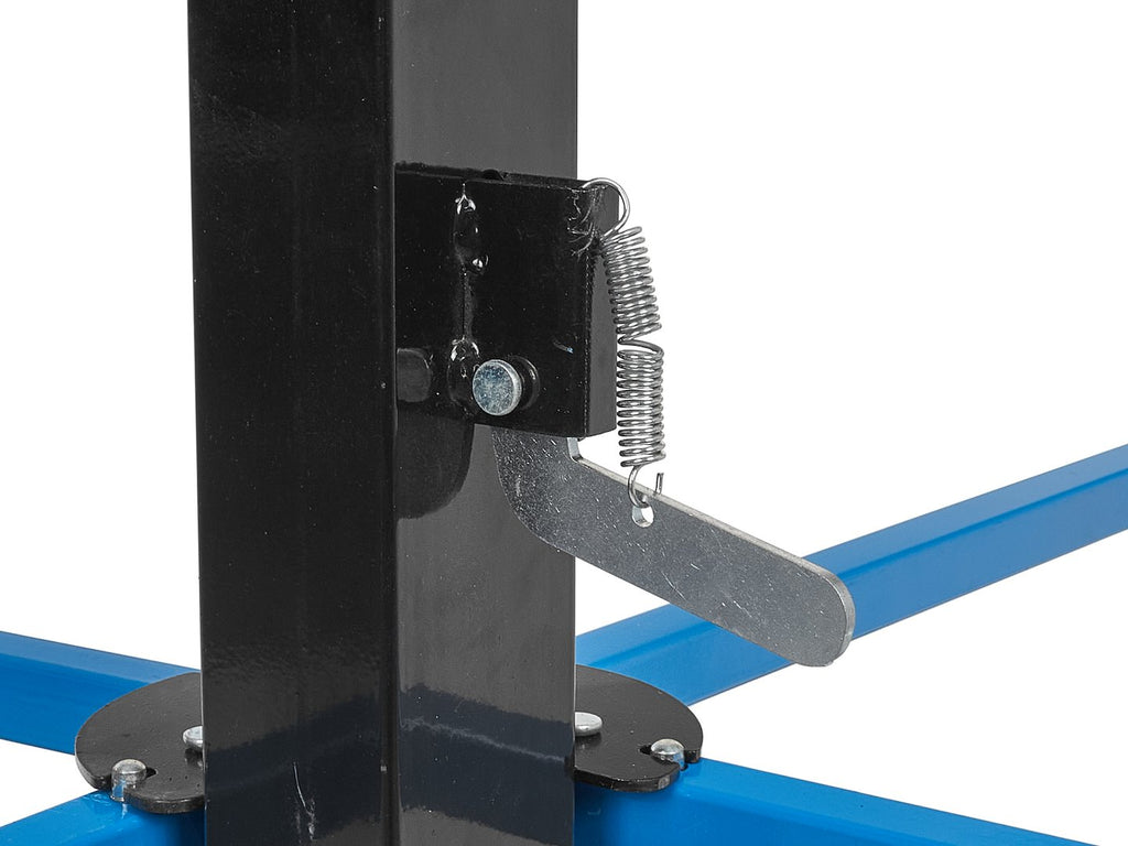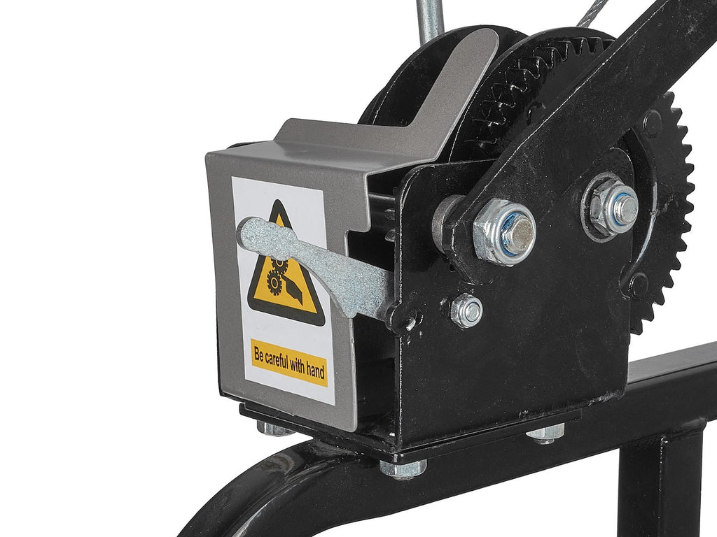 Солидната стоманена конструкция предлага стабилност и безопасност при употреба, а въртящите се PVC колела с диаметър 125 мм позволяват на оборудването да се движи лесно по всякаква повърхност. Вградените автоматични спирачки на лебедката и колелата гарантират стабилно задържане в желаната позиция. Благодарение на системата за сглобяване без инструменти и сгъваемите крака, устройството се сглобява бързо и се транспортира лесно, като има допълнително колело за маневриране в сгънато състояние.