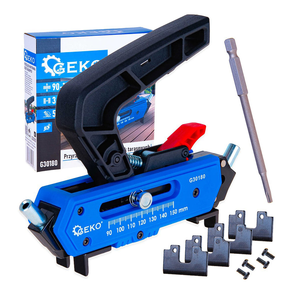 Устройството за монтаж на плочки на тераса със скрити винтове GEKO е предназначено за закрепване на терасни плочи със скрити винтове, като осигурява правилното позициониране на плочите и постоянен ъгъл на пробиване от 50°.
