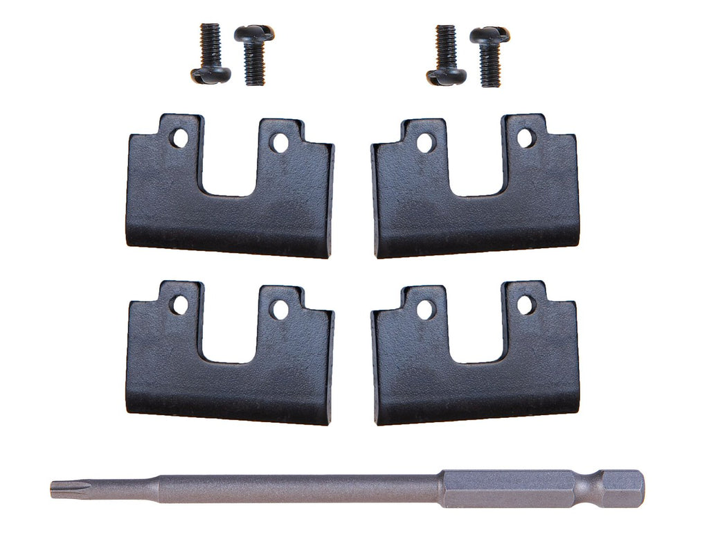 Комплектът включва монтажното устройство, 2 дистанционни елементи от 1 мм, 2 дистанционни елементи от 2 мм, 1 бит TORX-15 и 4 винта за монтаж на дистанционните елементи.