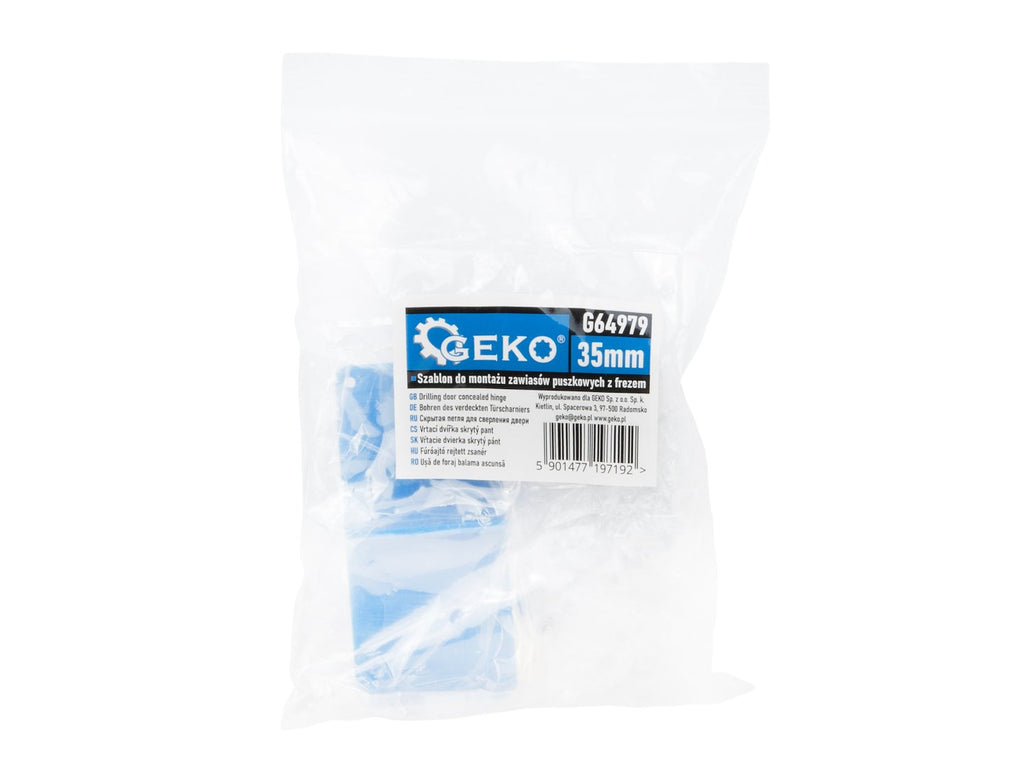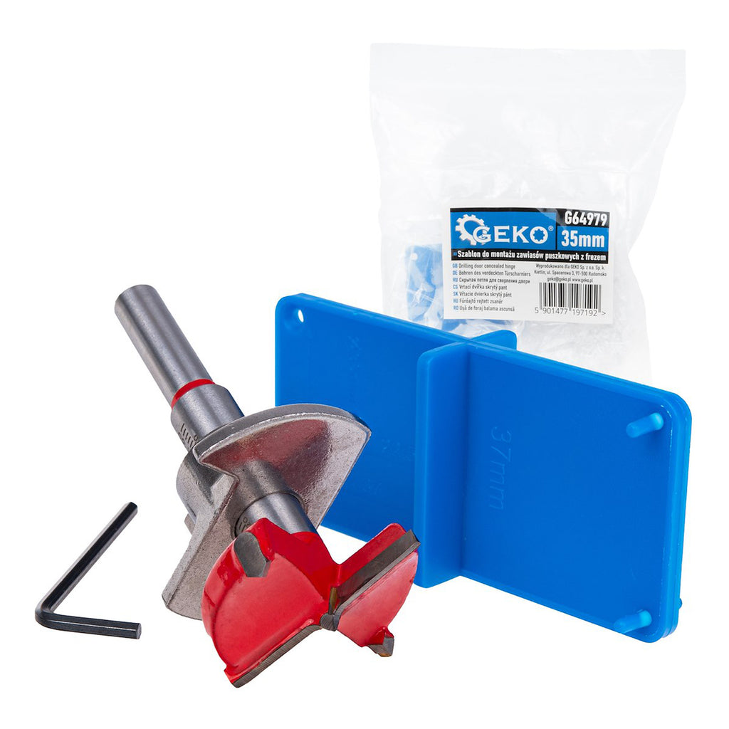 Този шаблон за монтаж на панти тип чаша с регулируема фреза 35 мм GEKO е предназначен за бърз и прецизен монтаж на панти тип чаша за мебели. Комплектът позволява точното маркиране на точките за пробиване върху вратата и корпуса на мебелта, както и пробиването на отвори с подходяща дълбочина.