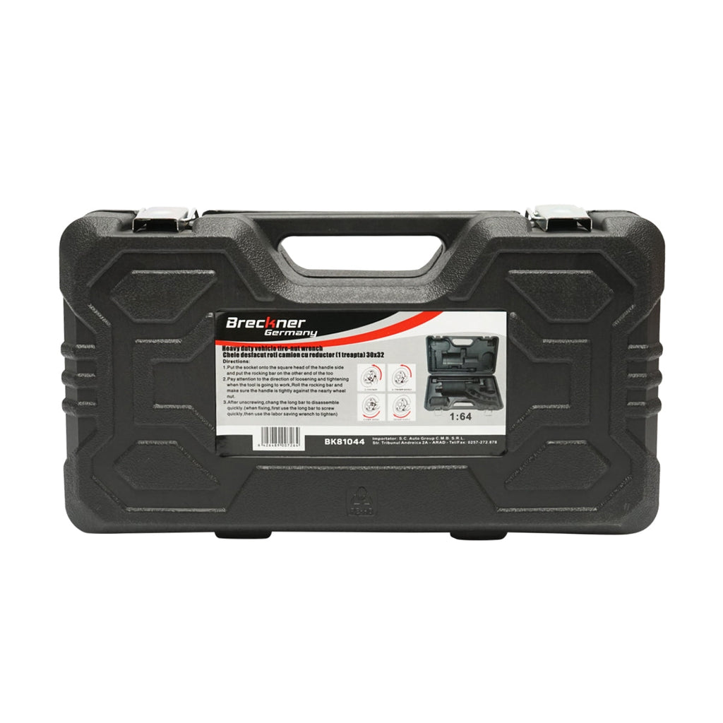 Този ключ за гуми на камиони 30x32 с редуктор 1 степен Breckner Germany включва 30- и 32-милиметров гаечен ключ и адаптер. Гаечният ключ е със скорост на въртене 1:64 и включва и редуктор с 1 скорост.