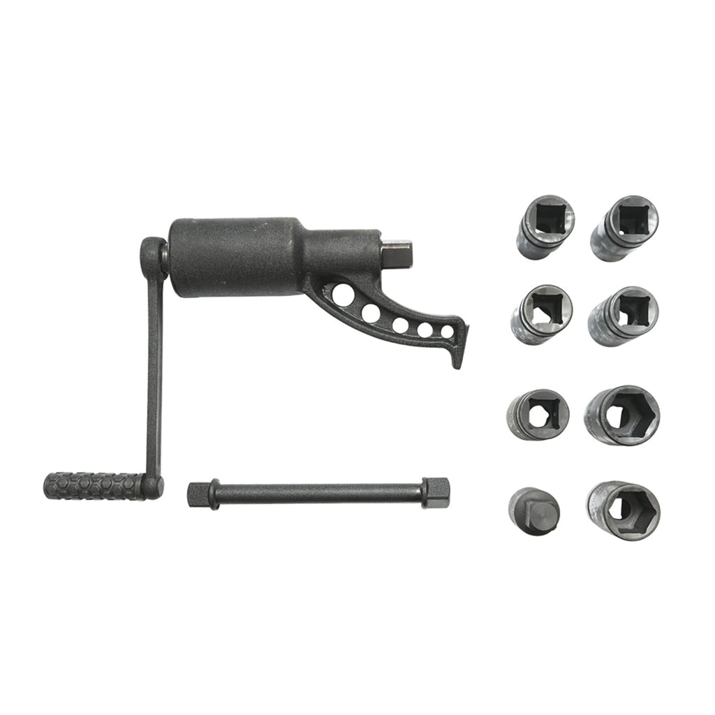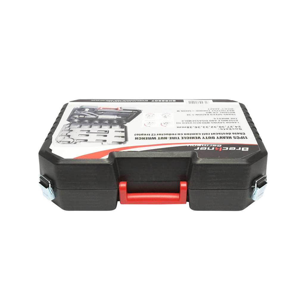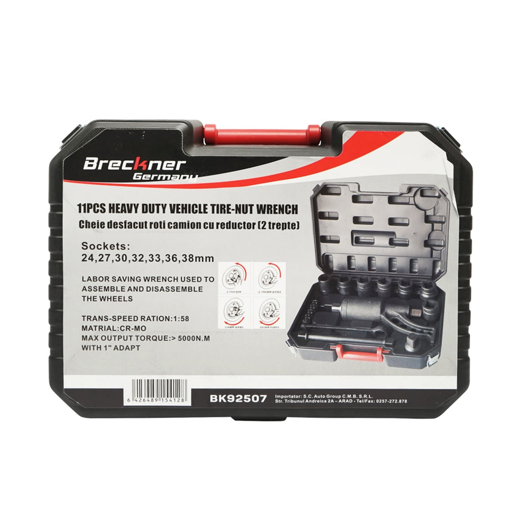 Този ключ за разхлабване на колела на камион с редуктор 2 скорости с вложки 24, 27, 30, 32, 33, 36, 38мм Breckner Germany съдържа 24, 27, 30, 32, 33, 36, 38 мм гнезда, размери на адаптера 1“, скорост на въртене 1:58 и максимален въртящ момент >5000 NM.