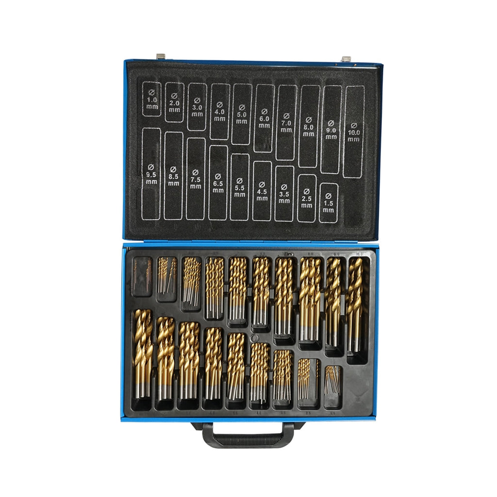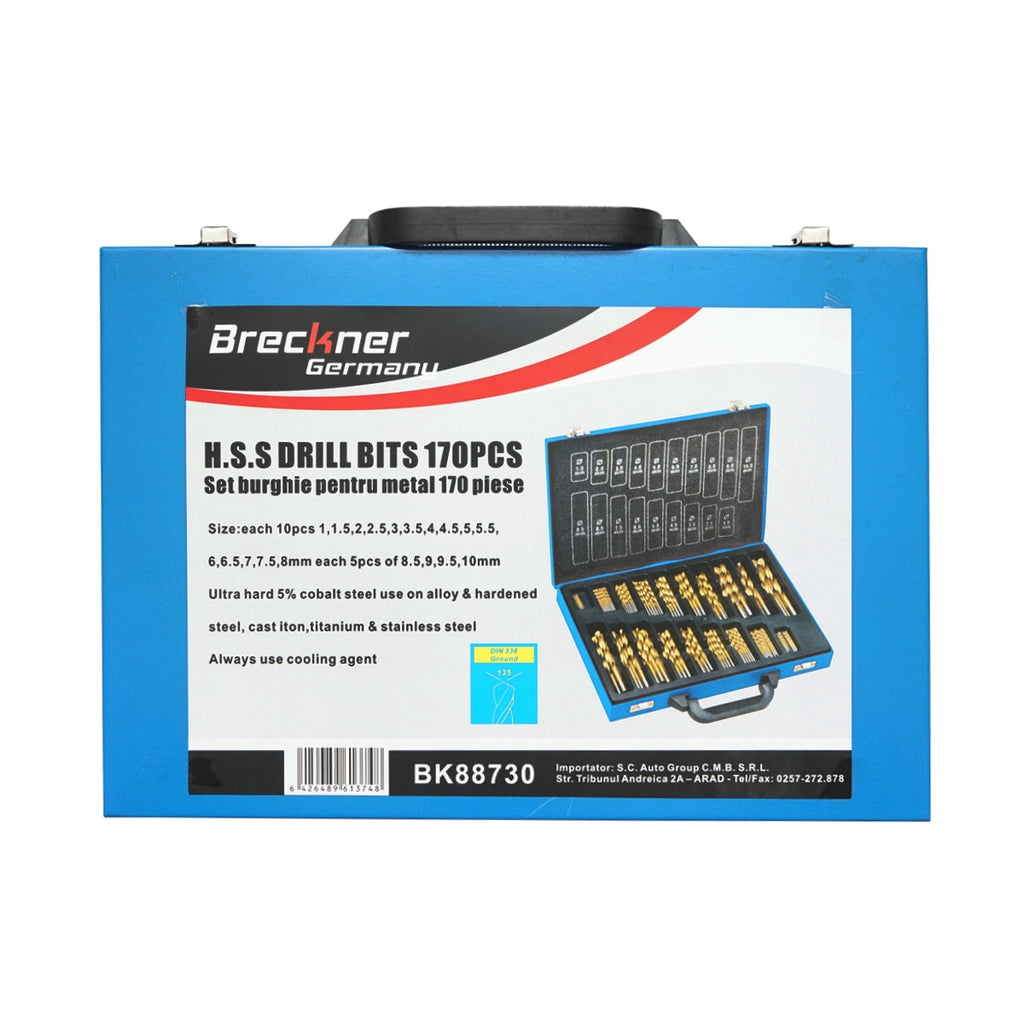 Този комплект от 170 свредла за метал HSS DIN338 Breckner Germany съдържа 10 свредла 1, 1,5, 2, 2,5, 3, 3,5, 4, 4,5, 5, 5,5, 6, 6,5, 7, 7,5, 8 мм и 5 свредла 8,5, 9, 9,5, 10 мм.